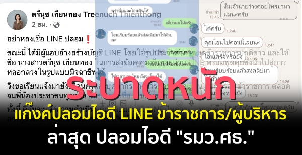 ขณะนี้ ได้มีผู้แอบอ้างสร้างบัญชี LINE โดยใช้รูปประจำตัวภาพชุดข้าราชการปกติขาว และใช้ชื่อ นางสาวตรีนุช เทียนทอง ในการส่งข้อความทักทายผ่าน LINE พร้อมพูดคุยซึ่งนำไปสู่การหลอกลวงในรูปแบบมิจฉาชีพได้