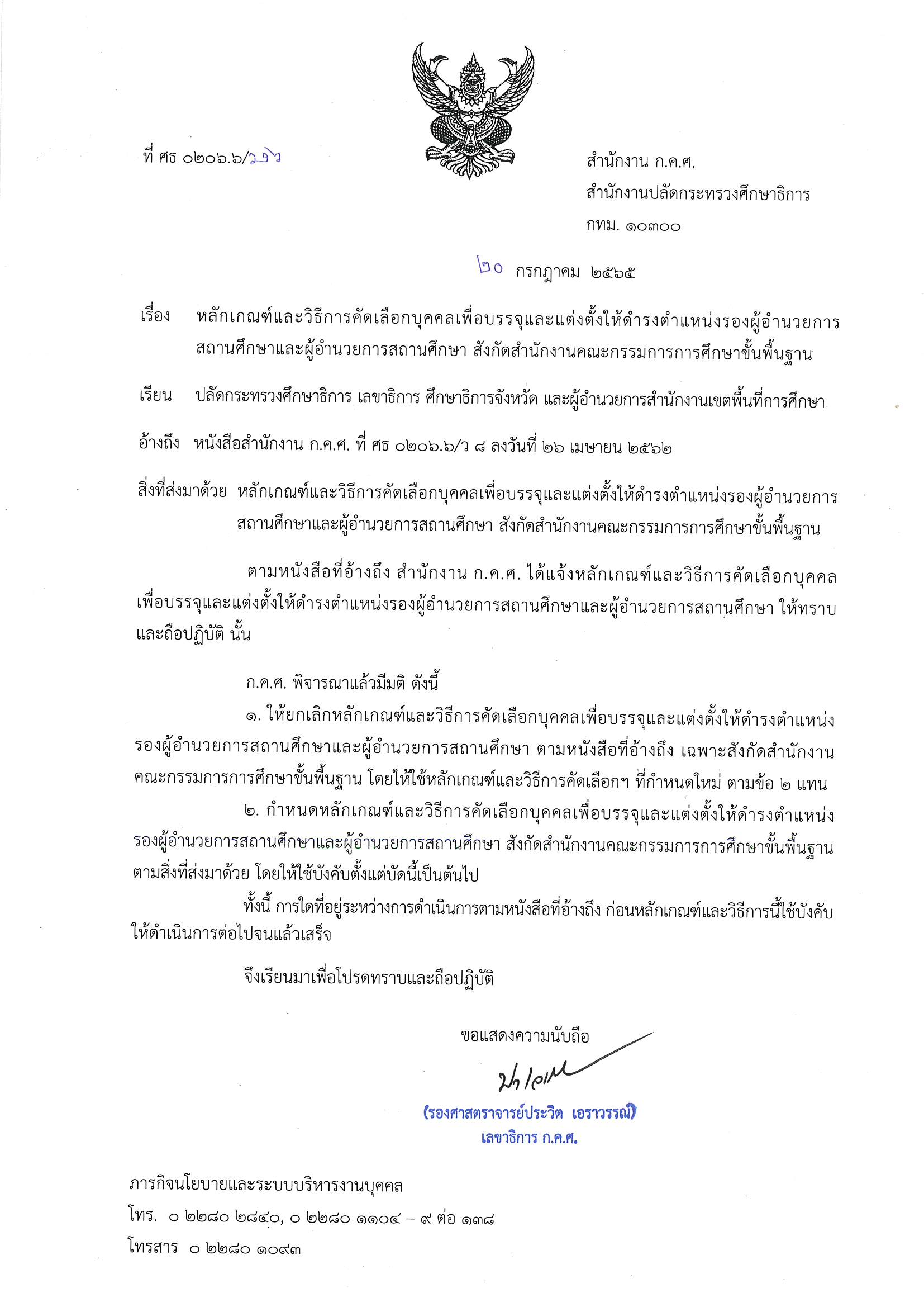 ตามหนังสือที่อ้างถึง สำนักงาน ก.ค.ศ. ได้แจ้งหลักเกณฑ์และวิธีการคัดเลือกบุคคล เพื่อบรรจุและแต่งตั้งให้ดำรงตำแหน่งรองผู้อำนวยการสถานศึกษาและผู้อำนวยการสถานศึกษา ให้ทราบ และถือปฏิบัติ นั้น