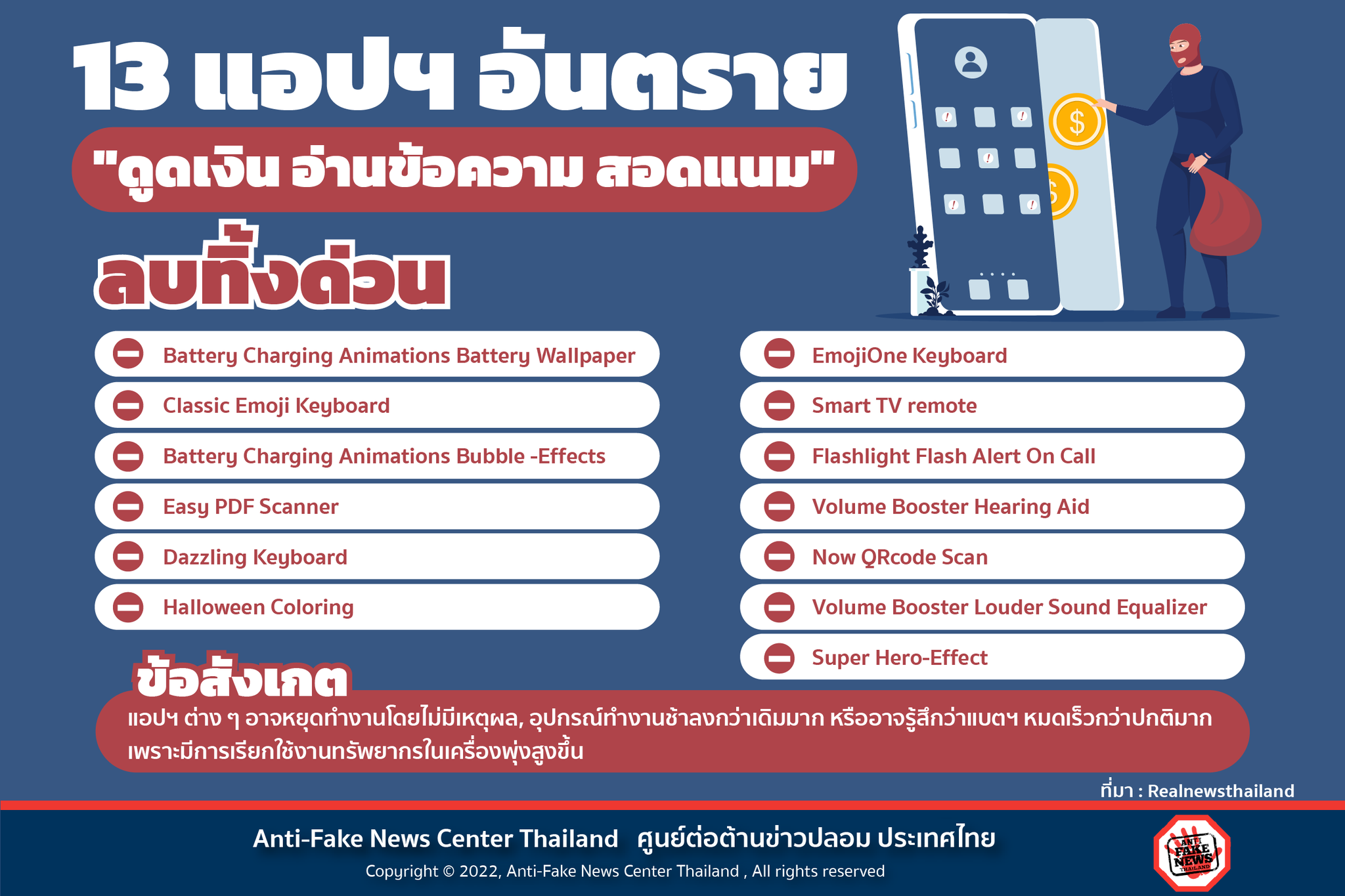 โดยเพจได้โพสต์ผ่านเฟซบุ๊กมีเนื้อหาระบุว่า มีรายงานจาก Kaspersky บริษัทรักษาความปลอดภัยด้านไอทีว่า พบแอปพลิเคชัน Joker หรือ แอปฯ ที่มีโฮสต์มัลแวร์ "อันตราย" ที่สามารถ ขโมยเงินสดของผู้ใช้ อ่านข้อความ และสอดแนมการทำงานต่าง ๆ ภายในเครื่องได้ โดยมีทั้งสิ้น 13 แอปฯ และแนะนำให้ผู้ใช้ลบทิ้งทันที
