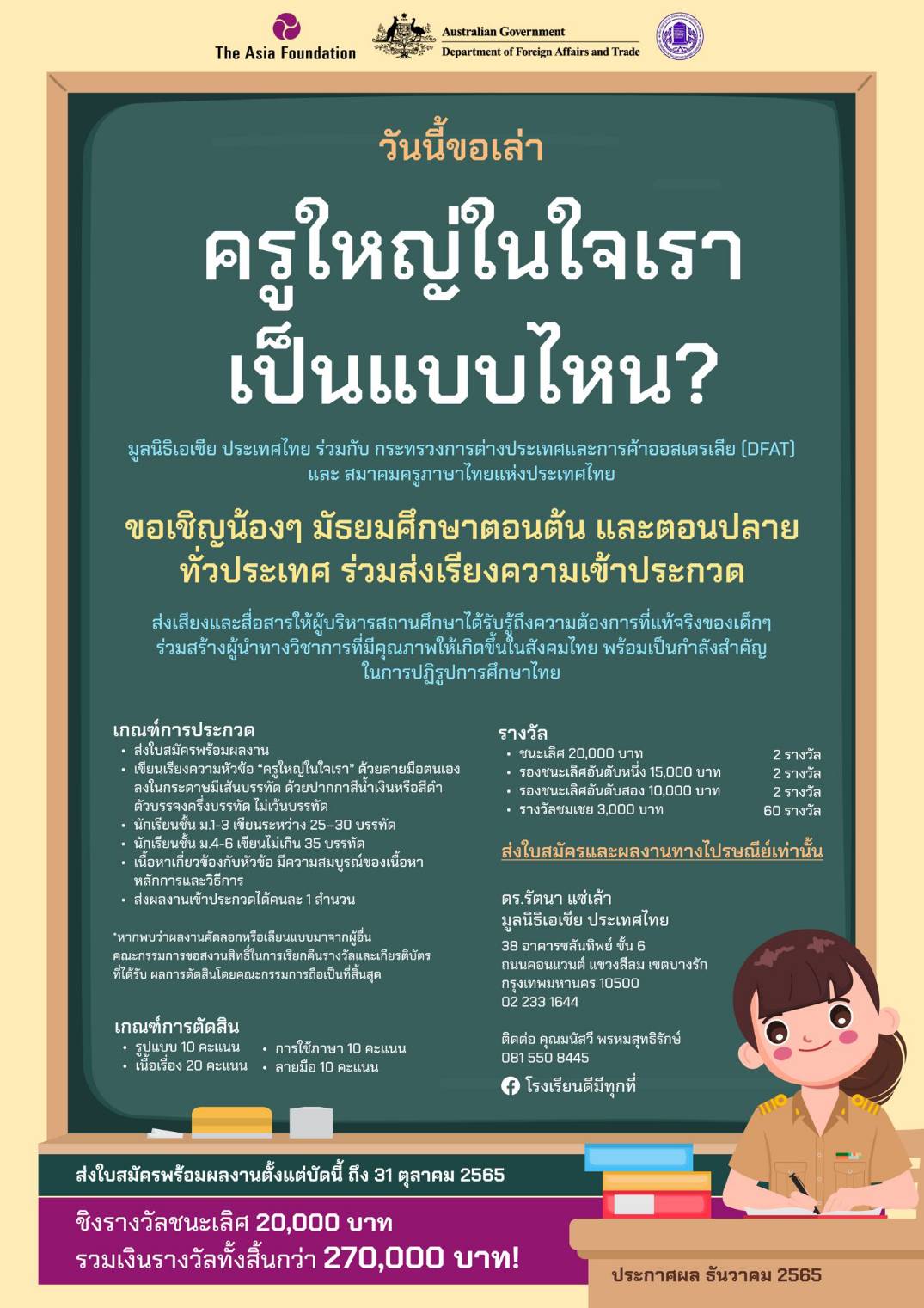 สำหรับหลักเกณฑ์การตัดสินนั้นประกอบด้วย 1)รูปแบบ 10 คะแนน คือต้องมีคำนำ เนื้อหา สรุป องค์ ประกอบครบและสมบูรณ์ตามหลักการใช้ภาษาไทย 2)เนื้อเรื่อง 20 คะแนน ต้องมีเนื้อหาสอดคล้องกับหัวข้อการประกวด อาจมีบริบททางสังคมหรือท้องถิ่นที่ตั้งของโรงเรียน แสดงถึงความโดดเด่น ลักษณะพิเศษของโรงเรียน และบุคลากรผู้นำในโรงเรียน หรือประเด็นในการอยู่ร่วมกับสังคมอย่างมีความสุขที่สามารถนำมาเป็นต้นแบบได้จริง สะท้อนทัศนคติ ความคิดความต้องการของผู้เขียนอย่างเหมาะสมตามวัย วุฒิ เรียงลำดับเหตุการณ์ได้อย่างต่อเนื่อง และสอดแทรกแนวคิดที่เป็นประโยชน์ในเชิงสร้างสรรค์ 3)การใช้ภาษา 10 คะแนน และ 4)ลายมือ 10 คะแนน รวมเป็น 50 คะแนน โดยผู้ชนะการประกวดจะได้รับเงินรางวัล 20,000 บาท (2 รางวัล), รองชนะเลิศอันดับหนึ่ง 15,000 บาท (2 รางวัล), รองชนะเลิศอันดับสอง 10,000 บาท (2 รางวัล) และรางวัลชมเชย 3,000 บาท (60 รางวัล) พร้อมรับเกียรติบัตรจากมูลนิธิฯ ทุกรางวัล รวมเป็นเงินทั้งสิ้นกว่า 270,000 บาท โดยผู้สนใจสามารถดาวน์โหลดใบสมัครที่ https://we.tl/t-vxl0T4UDr7 และส่งใบสมัครพร้อมผลงานมาทางไปรษณีย์ได้ที่ ดร.รัตนา แซ่เล้า มูลนิธิเอเชีย ประเทศไทย เลขที่ 38 อาคารชลันทิพย์ ชั้น 6 ถนนคอนแวนต์ แขวงสีลม เขตบางรัก กทม. 10500 ได้ตั้งแต่วันนี้-31 ต.ค.65