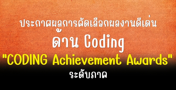 ตามที่สถาบันส่งเสริมการสอนวิทยาศาสตร์และเทคโนโลยี และกลุ่มพัฒนาการศึกษาสำหรับผู้มี ความสามารถพิเศษ สำนักวิชาการและมาตรฐานการศึกษา สำนักงานคณะกรรมการการศึกษาขั้นพื้นฐาน มอบหมายให้สำนักงานเขตพื้นที่การศึกษาตัวแทนแต่ละภูมิภาค เป็นเจ้าภาพในการคัดเลือกผลงานดีเด่นด้าน Coding "CODING Achievement Awards" ระดับภาคนั้น บัดนี้ การดำเนินการคัดเลือกผลงานดีเด่นด้าน Coding "CODING Achievement Awards" ระดับ ภาค เสร็จสิ้นเป็นที่เรียบร้อยแล้ว จึงขอประกาศรายชื่อผู้ได้รับคัดเลือกผลงานดีเด่นฯ ดังนี้