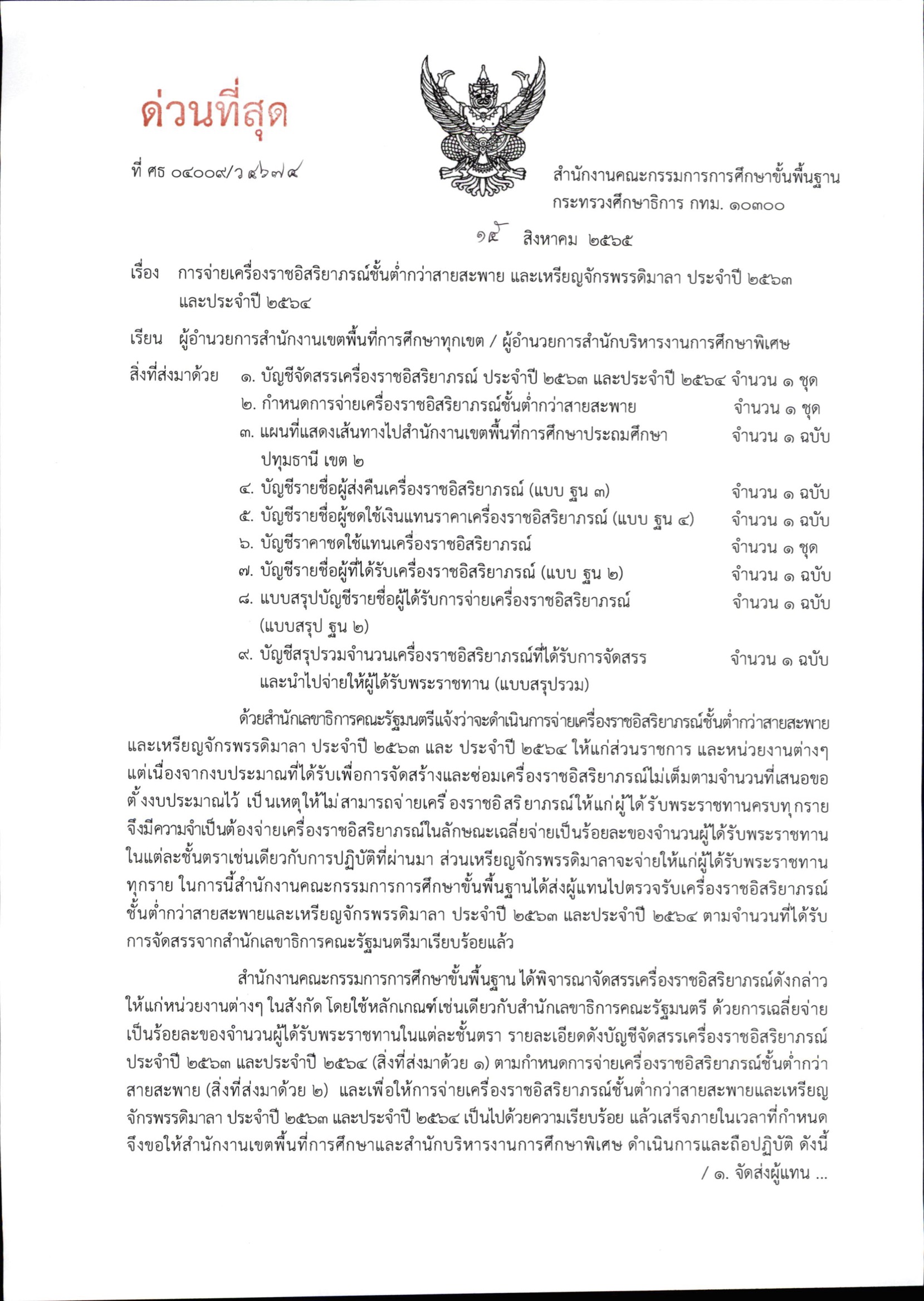ด่วนที่สุด ที่ ศธ 04009/ว 4674 การจ่ายเครื่องราชอิสริยาภรณ์ชั้นต่ำกว่าสายสะพาย และเหรียญจักรพรรดิมาลา ประจำปี 2563 และประจำปี 2564