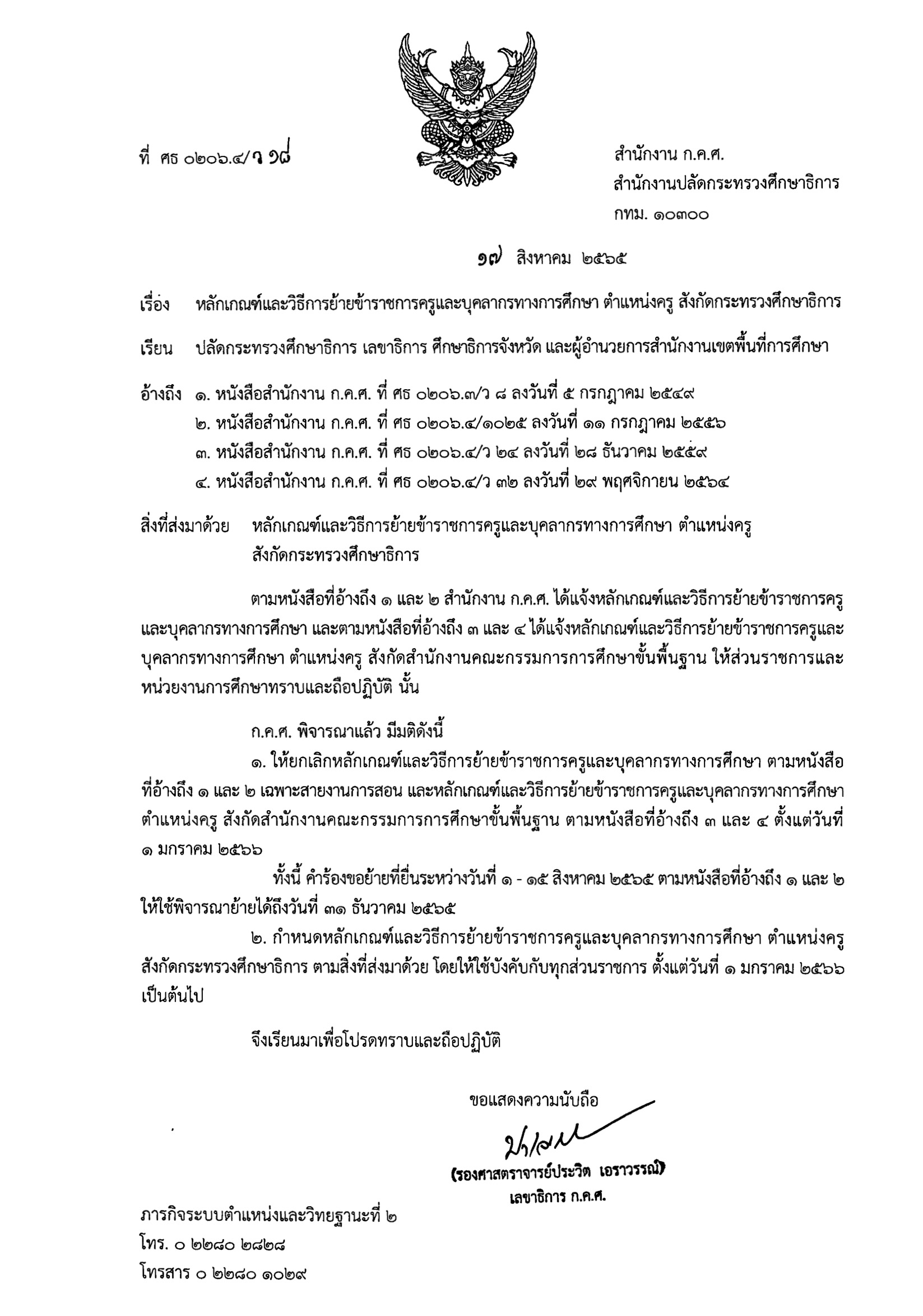 ทั้งนี้ คำร้องขอย้ายที่ยื่นระหว่างวันที่ ๑ - ๑๕ สิงหาคม ๒๕๖๕ ตามหนังสือที่อ้างถึง ๑ และ ๒ ให้ใช้พิจารณาย้ายได้ถึงวันที่ ๓๑ ธันวาคม ๒๕๖๕