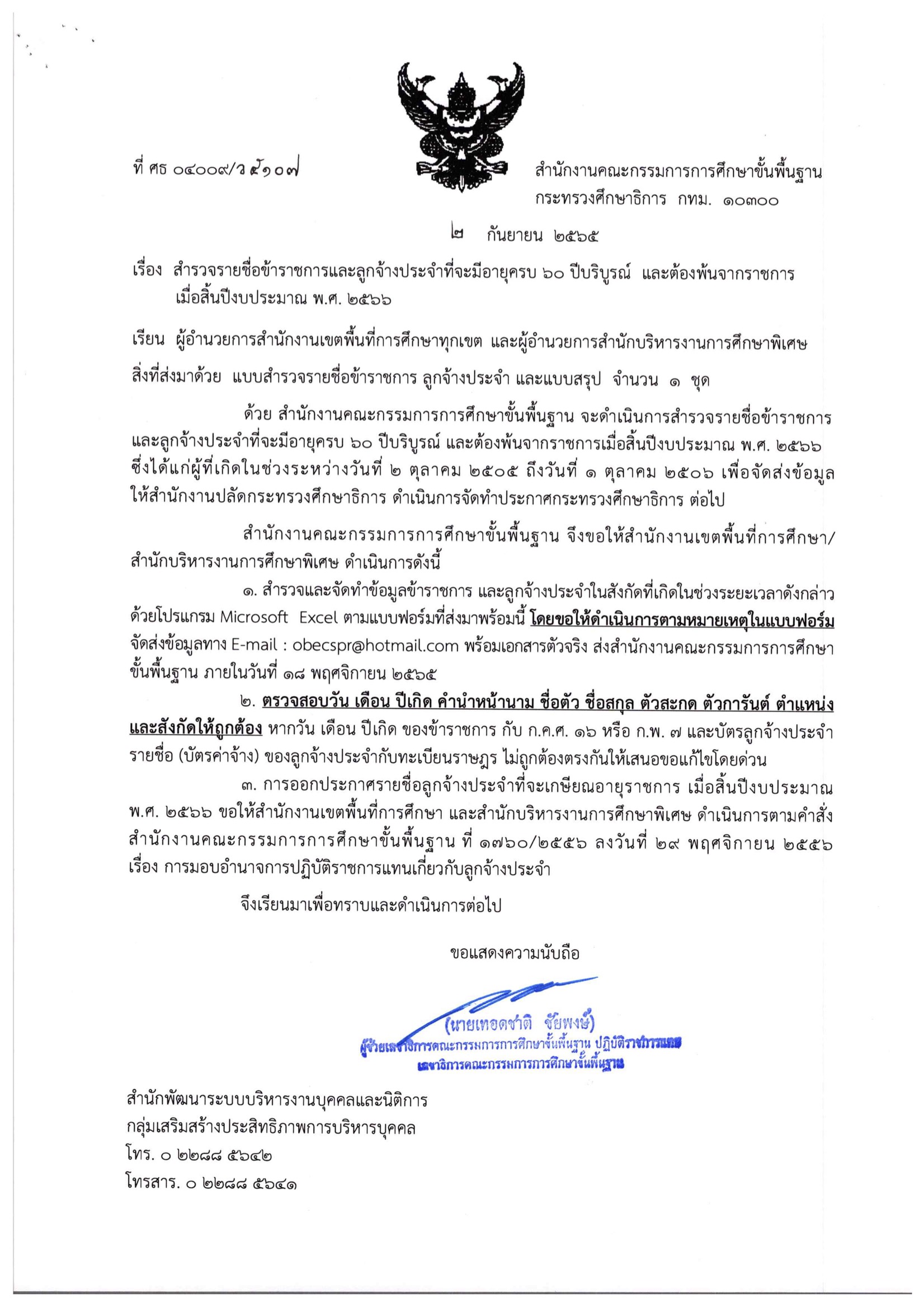 สพฐ.สำรวจรายชื่อข้าราชการและลูกจ้างประจำที่จะมีอายุครบ 60ปีบริบูรณ์ และต้องพ้นจากราชการเมื่อสิ้นปีงบประมาณ พ.ศ.2566