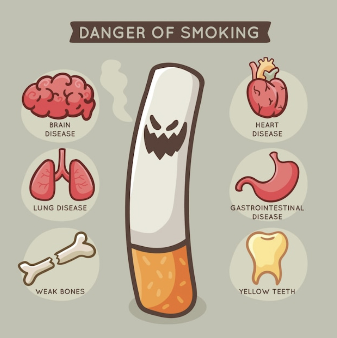 บุหรี่หนึ่งม้วนนั้นแม้จะว่ามีขนาดเล็กแต่สารต่างๆที่เป็นองค์ประกอบนั้นมีจำนวนมากมาย ซึ่งมีโอกาสส่งผลกระทบต่อสุขภาพร่างกายได้ไม่ว่าจะเป็บผู้สูบเองหรือผู้สูดดมเข้าไป และจะทำให้เสี่ยงต่อโรคต่างๆได้ ดังตอไปนี้ เช่น
