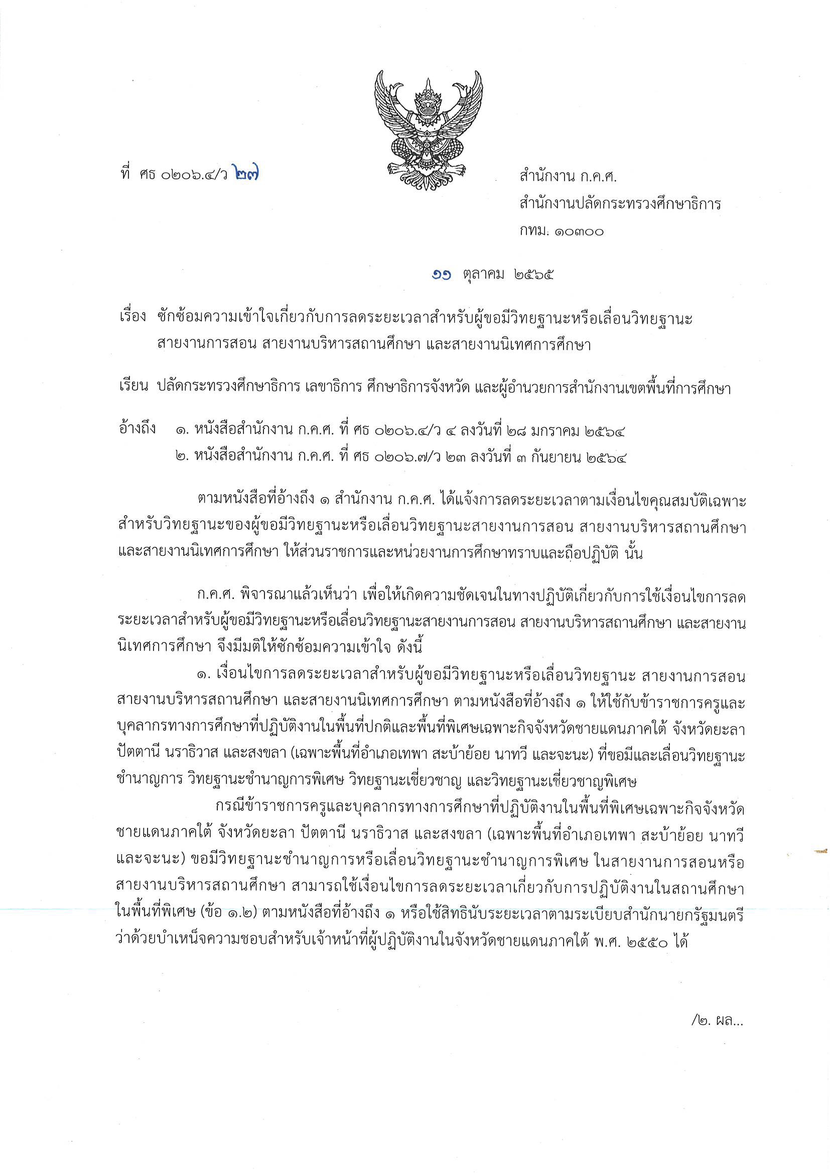 ว27/2565 ซักซ้อมความเข้าใจเกี่ยวกับการลดระยะเวลาสำหรับผู้ขอมีวิทยฐานะหรือเลื่อนวิทยฐานะสายงานการสอน สายงานบริหารสถานศึกษา และสายงานนิเทศการศึกษา
