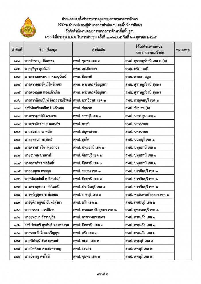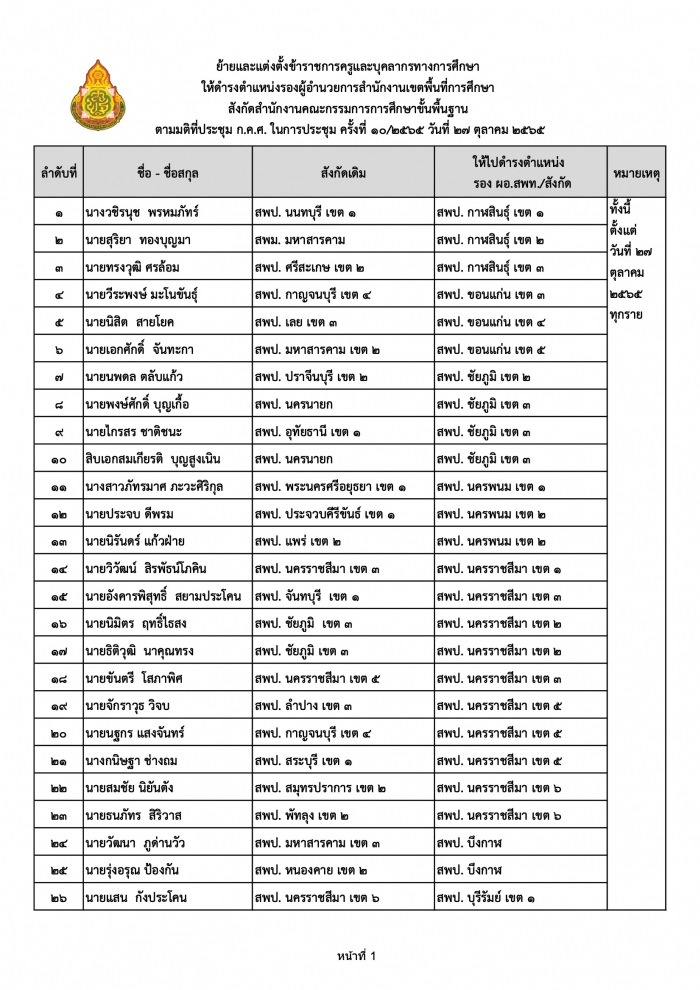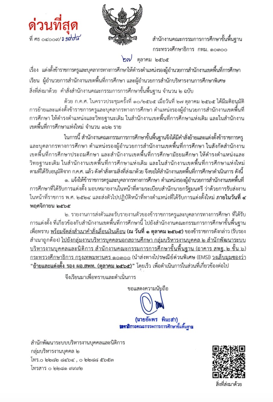 สำนักงานคณะกรรมการการศึกษาขั้นพื้นฐาน มีคำสั่งย้ายและแต่งตั้งข้าราชการครูและบุคลากรทางการศึกษา ให้ดำรงตำแหน่ง รองผู้อำนวยการสำนักงานเขตพื้นที่การศึกษา สังกัด สพฐ. ตามมติ ก.ค.ศ.เมื่อวันที่ 27 ตุลาคม 2565