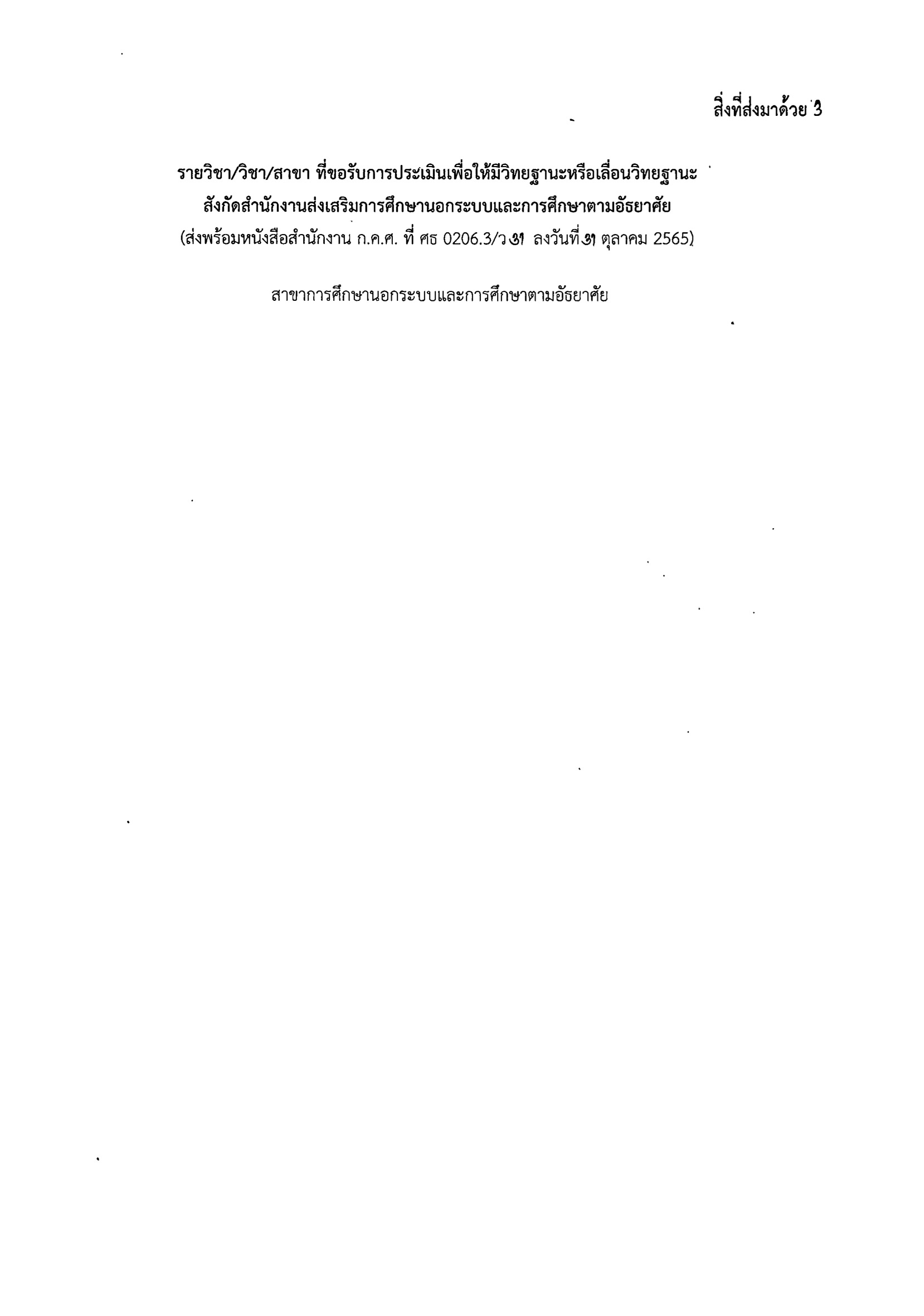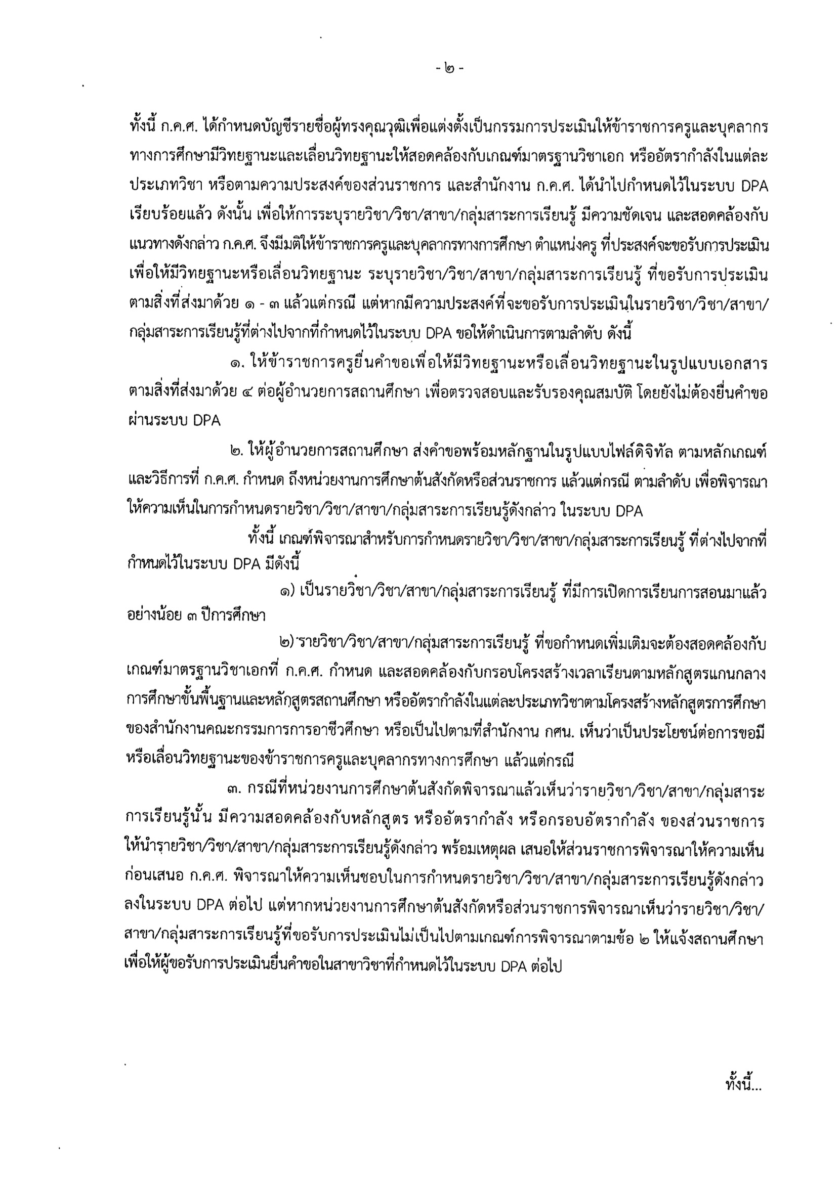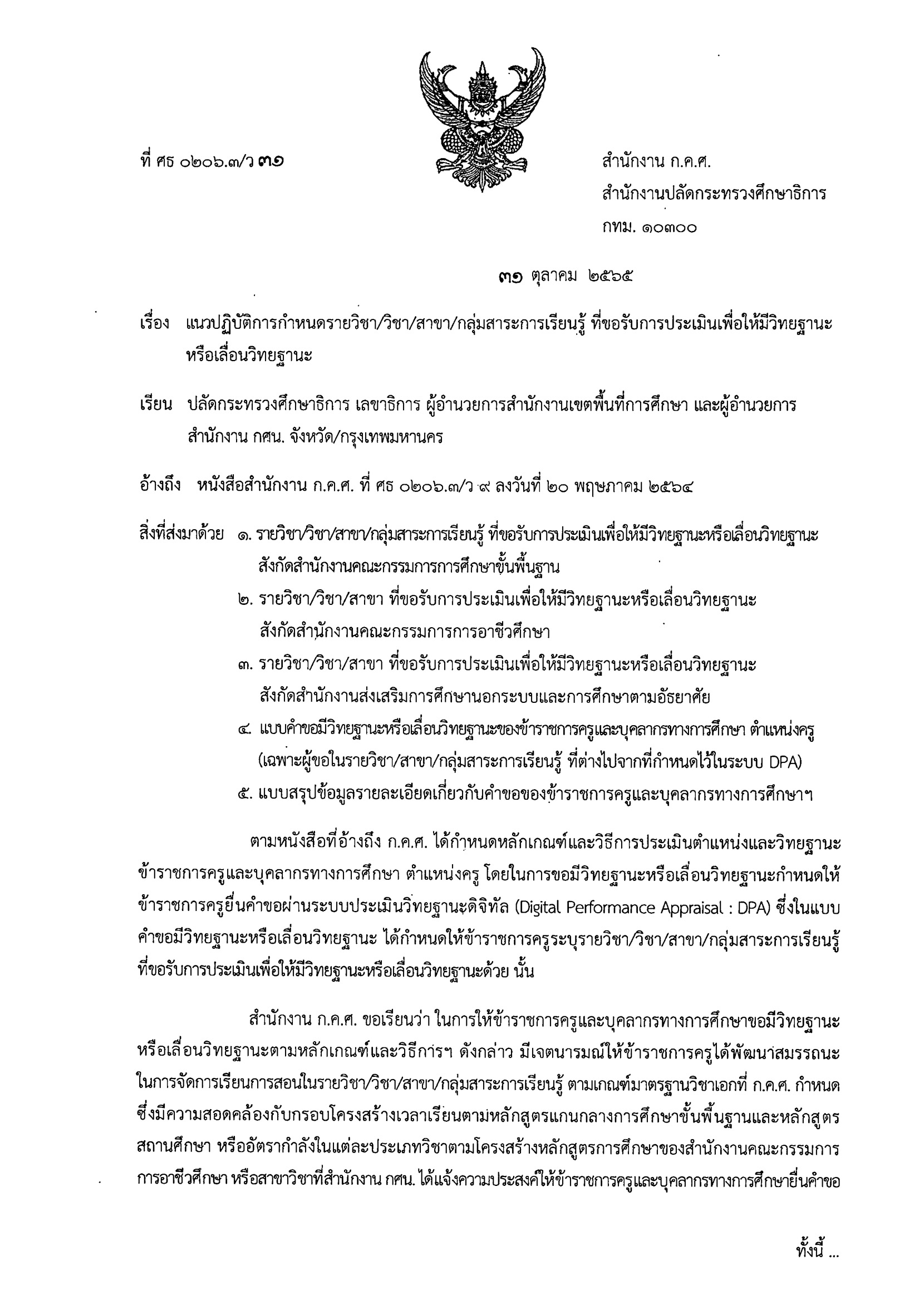 ว 31/2565 แนวปฏิบัติการกำหนดรายวิชา/วิชา/สาขา/กลุ่มสาระการเรียนรู้ ที่ขอรับการประเมินเพื่อให้มีวิทยฐานะหรือเลื่อนวิทยฐานะแบบคำขอเลื่อนวิทยฐานะแบบขอวิทยฐานะ DPA