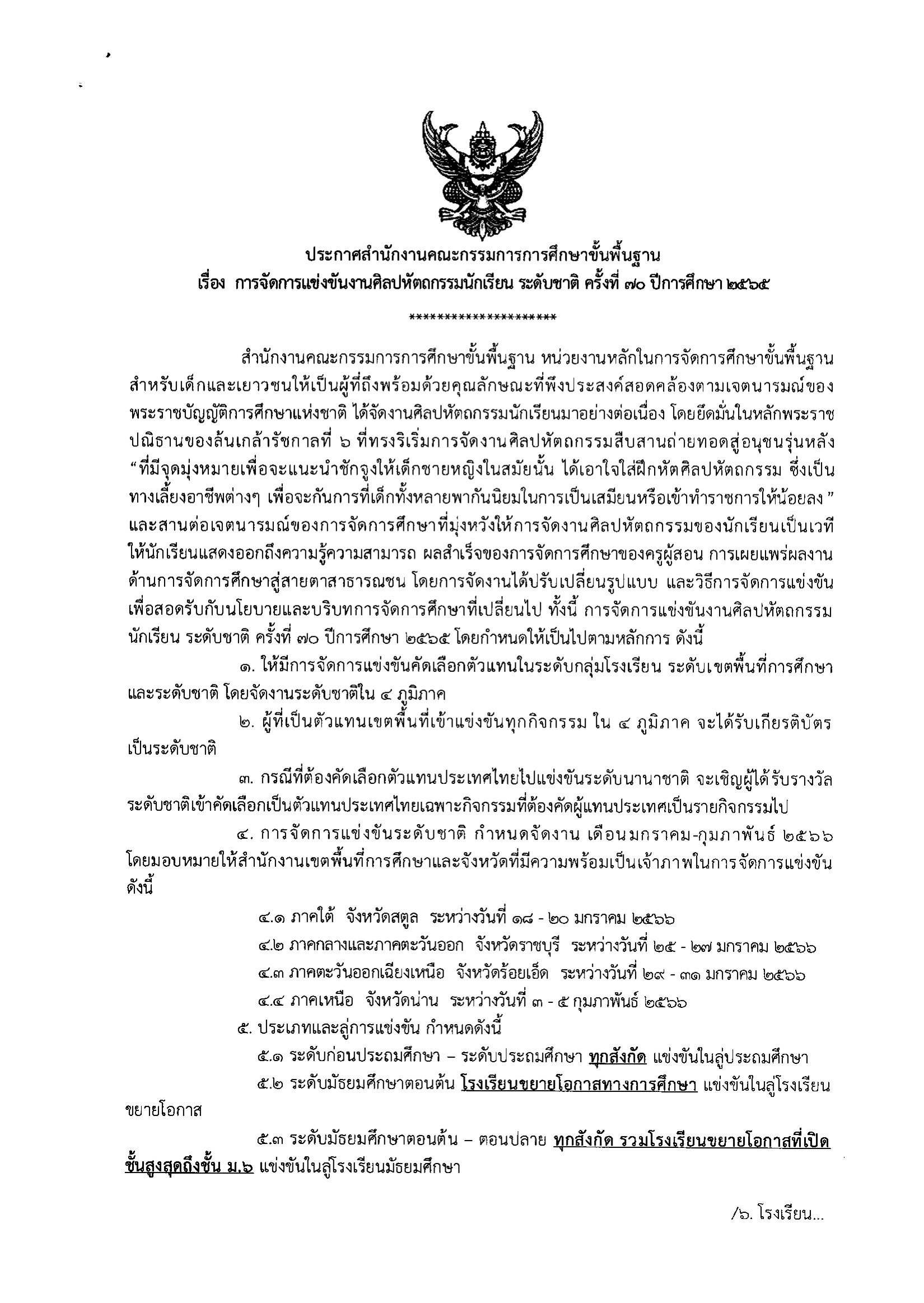 สำนักงานคณะกรรมการการศึกษาขั้นพื้นฐาน ขอแจ้งประกาศการจัดการแข่งขัน งานศิลปหัตถกรรมนักเรียน ระดับชาติ ครั้งที่ 70 ปีการศึกษา 2565 ให้สำนักงานเขตพื้นที่การศึกษาทุกเขต สถานศึกษาในสังกัดและผู้เกี่ยวข้องทราบ