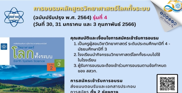 สถาบันส่งเสริมการสอนวิทยาศาสตร์และเทคโนโลยี (สสวท.) รับสมัครคุณครูอบรมเพิ่มพูนทักษะความรู้ “การอบรมหลักสูตรวิทยาศาสตร์โลกทั้งระบบ (ฉบับปรับปรุง 2564) ปีงบประมาณ 2566” ในรูปแบบออนไลน์ ผ่านโปรแกรม ZOOM รุ่นที่ 4 อบรมวันที่ 30, 31 มกราคม และ 3 กุมภาพันธ์ 2566 ผู้สมัครต้องสอนในโรงเรียนระดับประถมศึกษา ปีที่ 4 - 6 และมัธยมศึกษาปีที่ 1-3 โดยเป็นคุณครูผู้สอนวิชาวิทยาศาสตร์ (ไม่จำกัดจำนวน) ซึ่งโรงเรียนได้นำกิจกรรมวิทยาศาสตร์โลกทั้งระบบไปใช้ในโรงเรียนด้วย สมัครฟรีได้ตั้งแต่บัดนี้ถึง 26 ธันวาคม 2565 ดูรายละเอียดและดาวน์โหลด ใบสมัครที่เฟซบุ๊ก โครงการ GLOBE https://www.facebook.com/globethailand2015 ส่งแบบตอบการรับการอบรมที่ผู้อำนวยการโรงเรียนลงนามรับรองเรียบร้อยแล้วที่ essipst@gmail.com