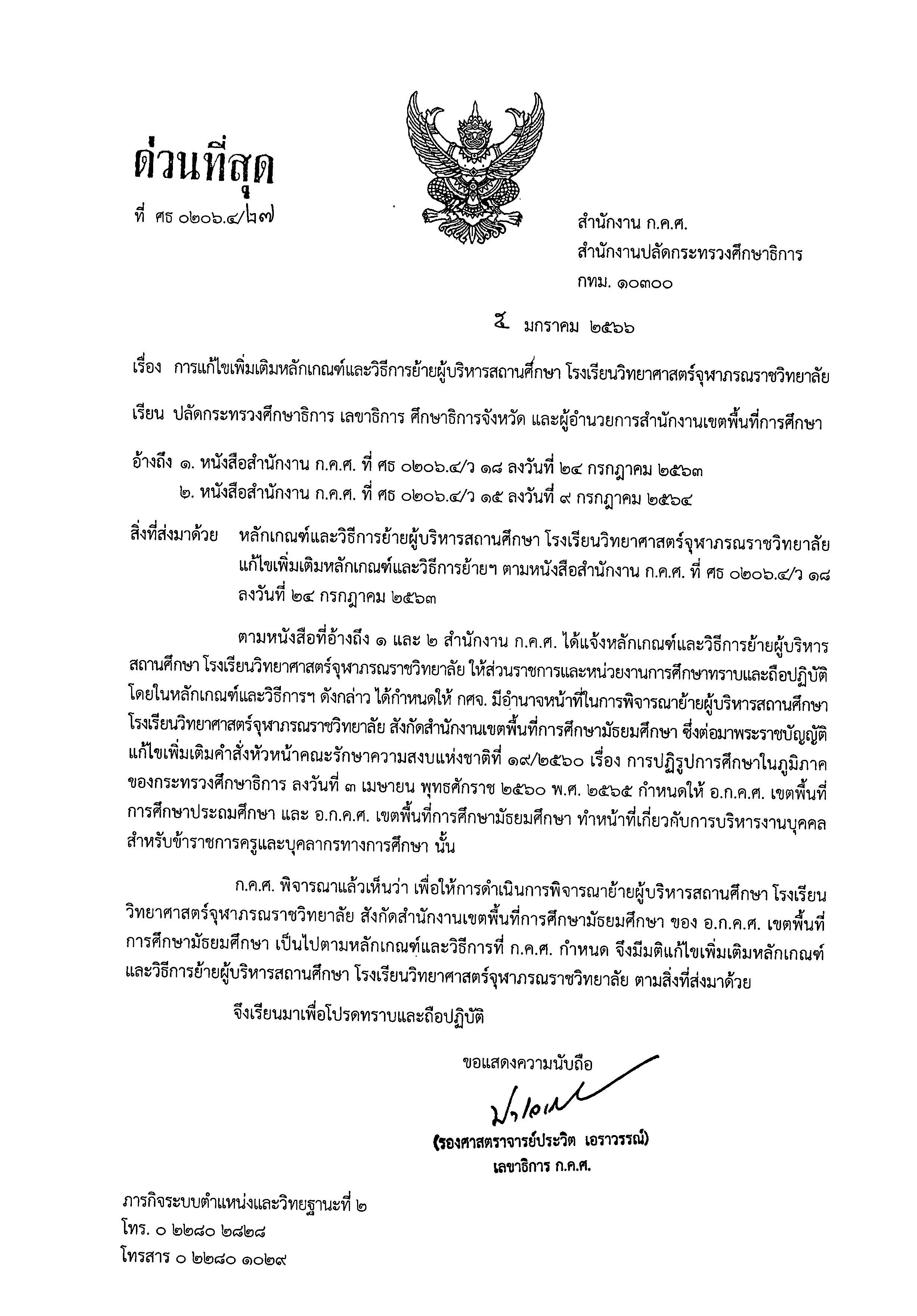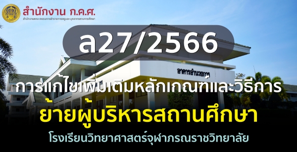 ล27/2566 การแก้ไขเพิ่มเติมหลักเกณฑ์และวิธีการย้ายผู้บริหารสถานศึกษา โรงเรียนวิทยาศาสตร์จุฬาภรณราชวิทยาลัย