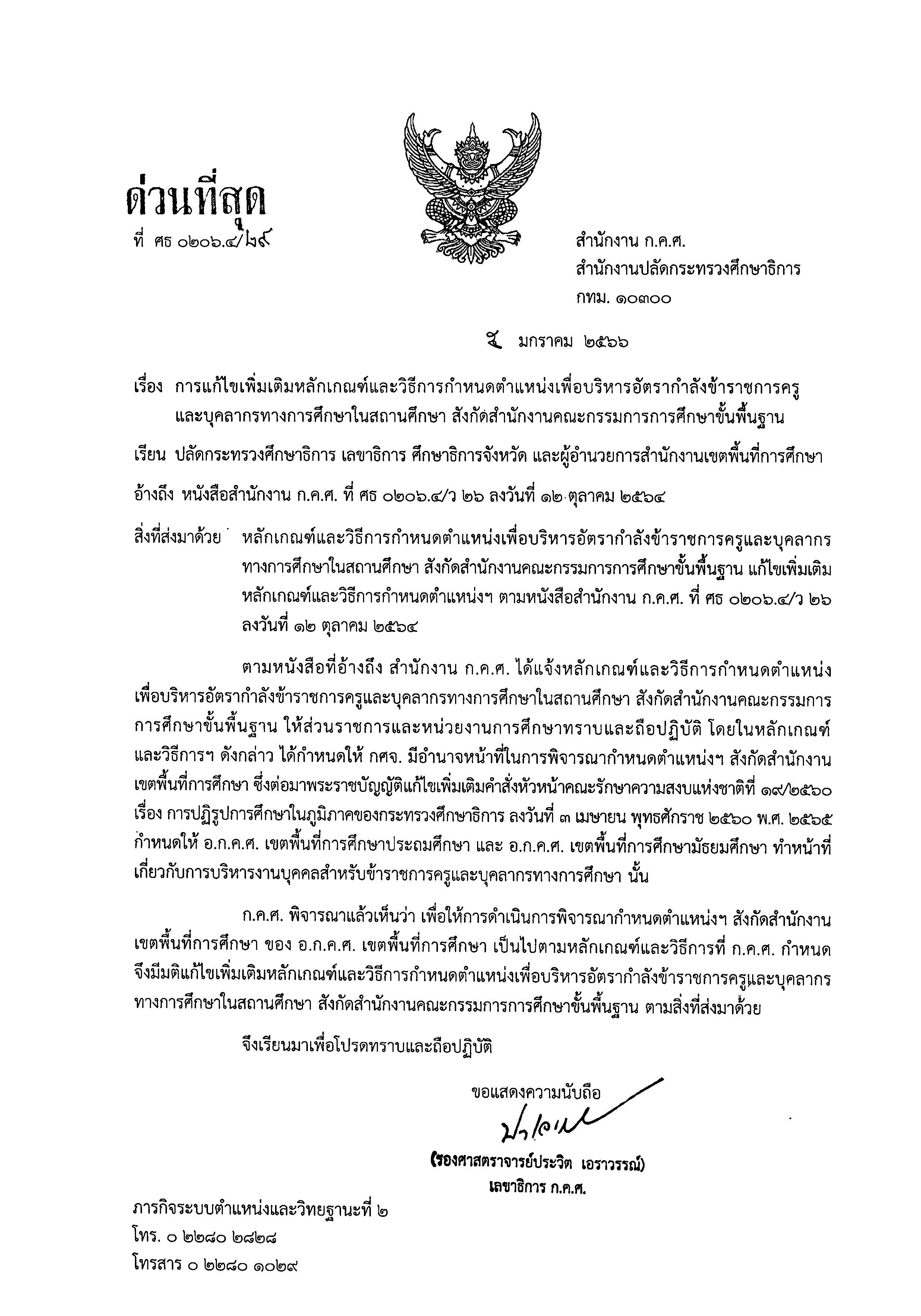 ล29/2566 การแก้ไขเพิ่มเติมหลักเกณฑ์และวิธีการกำหนดตำแหน่งเพื่อบริหารอัตรากำลังข้าราชการครูและบุคคลากรทางการศึกษาในสถานศึกษา สังกัดสำนักงานคณะกรรมการการศึกษาขั้นพื้นฐาน