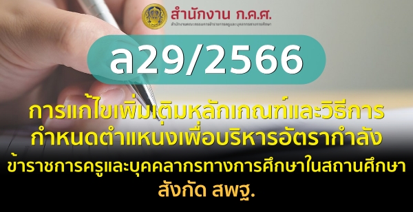 ล29/2566 การแก้ไขเพิ่มเติมหลักเกณฑ์และวิธีการกำหนดตำแหน่งเพื่อบริหารอัตรากำลังข้าราชการครูและบุคคลากรทางการศึกษาในสถานศึกษา สังกัด สพฐ.