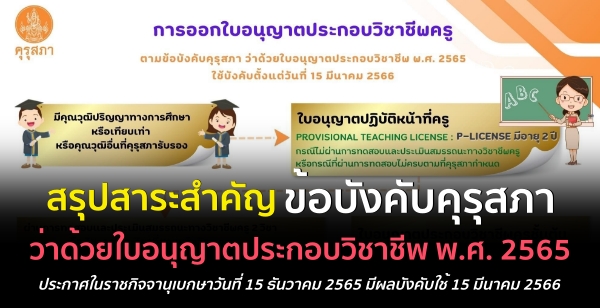 ผศ.ดร.อมลวรรณ วีระธรรมโม เลขาธิการคุรุสภา กล่าวว่า ตามที่ประกาศในราชกิจจานุเบกษา ได้เผยแพร่ข้อบังคับคุรุสภา ว่าด้วยใบอนุญาตประกอบวิชาชีพ พ.ศ. 2565 ซึ่งประกาศในราชกิจจานุเบกษา เมื่อวันที่ 15 ธันวาคม 2565 และมีผลบังคับใช้ 15 มีนาคม 2566 มีสาระสำคัญ ดังนี้