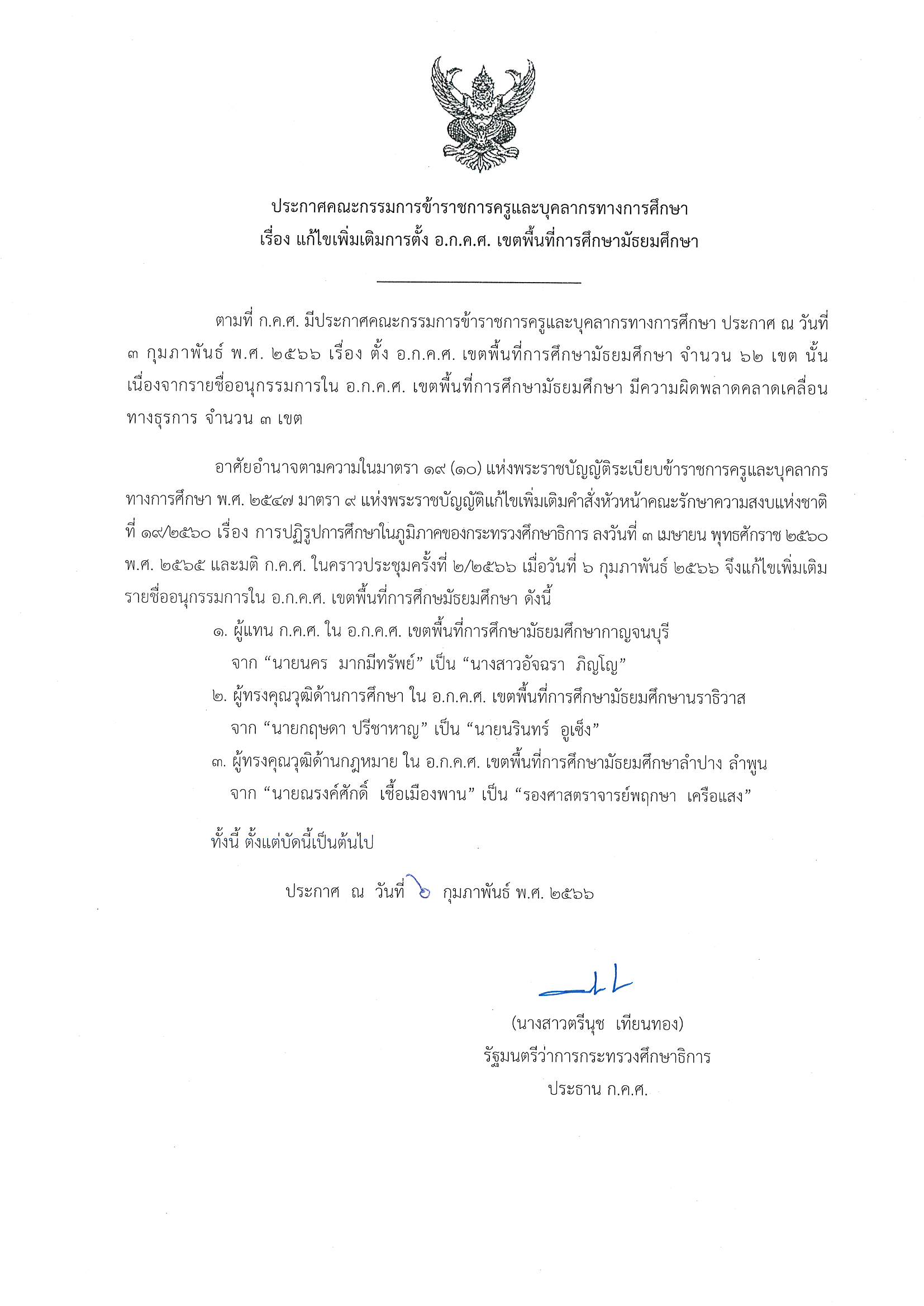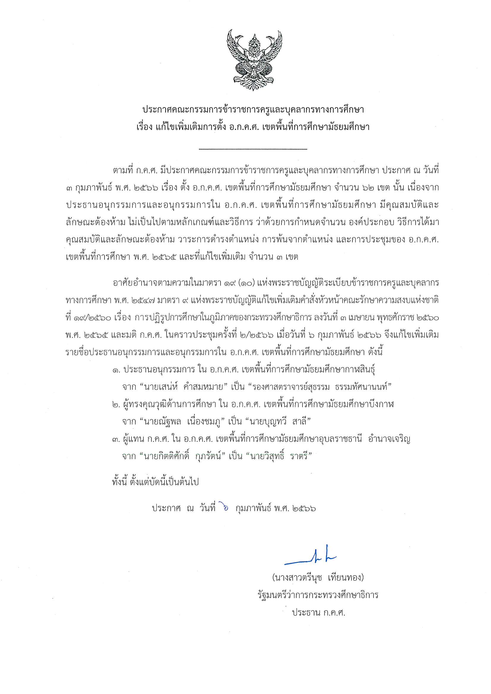 ประกาศ ก.ค.ศ. เรื่อง แก้ไขเพิ่มเติมการตั้ง อ.ก.ค.ศ. เขตพื้นที่การศึกษามัธยมศึกษา