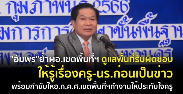 “สิ่งที่ผมมีข้อห่วงใย คือ จะบริหารงาน อ.ก.ค.ศ.เขตพื้นที่ฯ อย่างไรถึงจะประทับใจครู บริหารงานอย่างไรไม่ให้เกิดคำครหา เพราะวันนี้มีคนคอยจับตาเรื่องนี้อยู่ ทำดีแค่อยู่ตัว ทำผิดพลาดได้ขึ้นข่าวหน้าหนึ่งแน่นอน อำนาจการบริหารงานบุคคลเคยไปอยู่ที่คณะกรรมการศึกษาธิการจังหวัด (กศจ.) เพราะเหตุผลใด ผู้อำนวยการเขตพื้นที่ฯ ทุกคนก็ทราบอยู่แล้ว ดังนั้น ผู้อำนวยการเขตพื้นที่ฯ จะเป็นกลไกสำคัญในการขับเคลื่อน อ.ก.ค.ศ.เขตพื้นที่ฯ จึงอยากให้ผู้อำนวยการเขตพื้นที่ฯ ทำความเข้าใจกับ อ.ก.ค.ศ.เขตพื้นที่ฯ ให้ดี ทุกวันนี้เราจะเห็นข่าวเกี่ยวข้องกับครู และนักเรียนเป็นประจำ ที่ผ่านมาเขตพื้นที่ฯ จะรายงานเรื่องที่เกิดขึ้นให้ผมทราบหลังจากเป็นข่าวแล้วเสมอ ไม่มีเขตพื้นที่ไหนรับรู้ปัญหาก่อนที่จะเป็นข่าวแม้แต่ครั้งเดียว ภัยต่างๆ เราห้ามไม่ได้ แต่เราสามารถบริหารจัดการได้ คือ ต้องมีมาตรการป้องกันให้เพียงพอ เมื่อเกิดเหตุต้องบริหารจัดการให้รวดเร็ว เข้าถึงปัญหาให้ไว จะระงับเหตุอย่างไร และควรช่วยเหลือเด็กอย่างรวดเร็ว“ ดร.อัมพร กล่าว