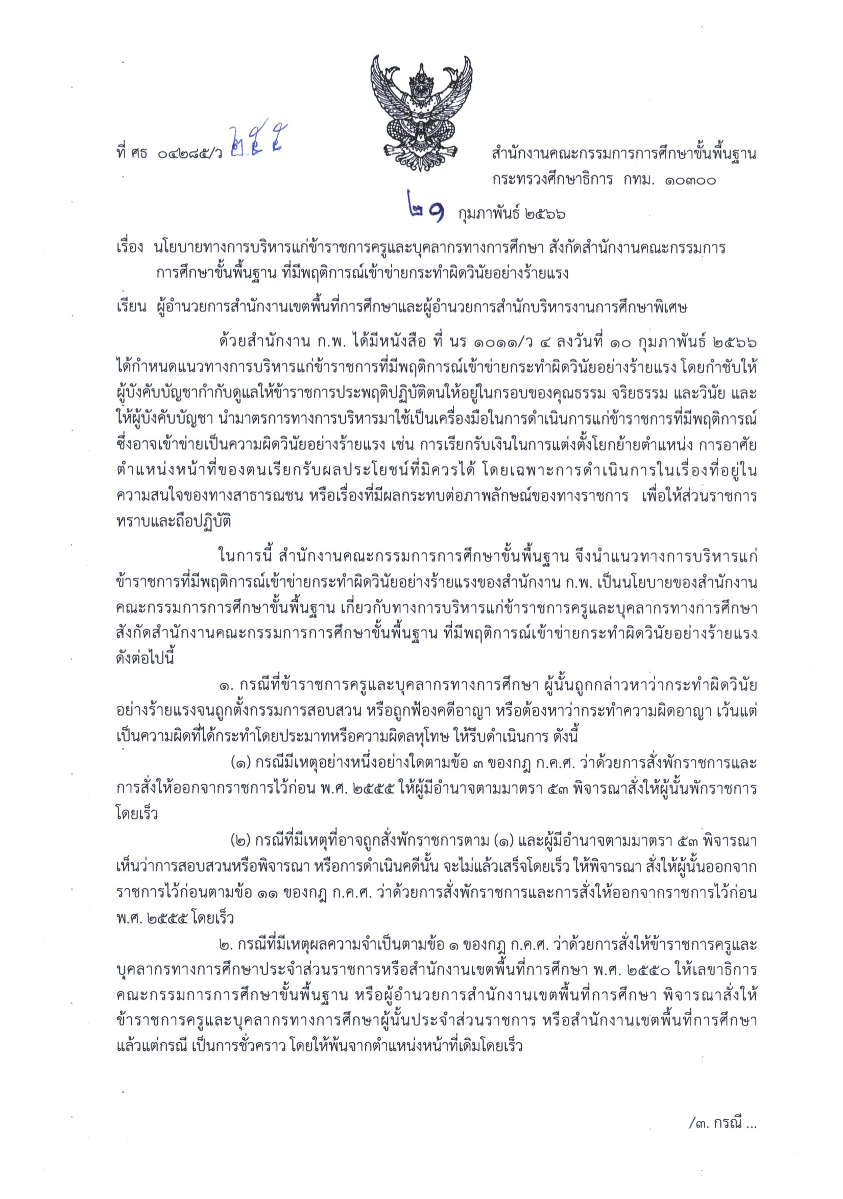 นโยบายทางการบริหารแก่ข้าราชการครูและบุคลากรทางการศึกษา สังกัด สพฐ. ที่มีพฤติการณ์เข้าข่ายกระทำผิดวินัยอย่างร้ายแรง