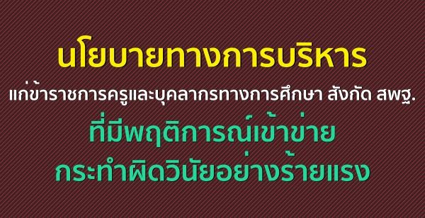นโยบายทางการบริหารแก่ข้าราชการครูและบุคลากรทางการศึกษา สังกัด สพฐ. ที่มีพฤติการณ์เข้าข่ายกระทำผิดวินัยอย่างร้ายแรงนโยบายทางการบริหารแก่ข้าราชการครูและบุคลากรทางการศึกษาสังกัดสพฐ.ที่มีพฤติการณ์เข้าข่ายกระทำผิดวินัยอย่างร้ายแรง