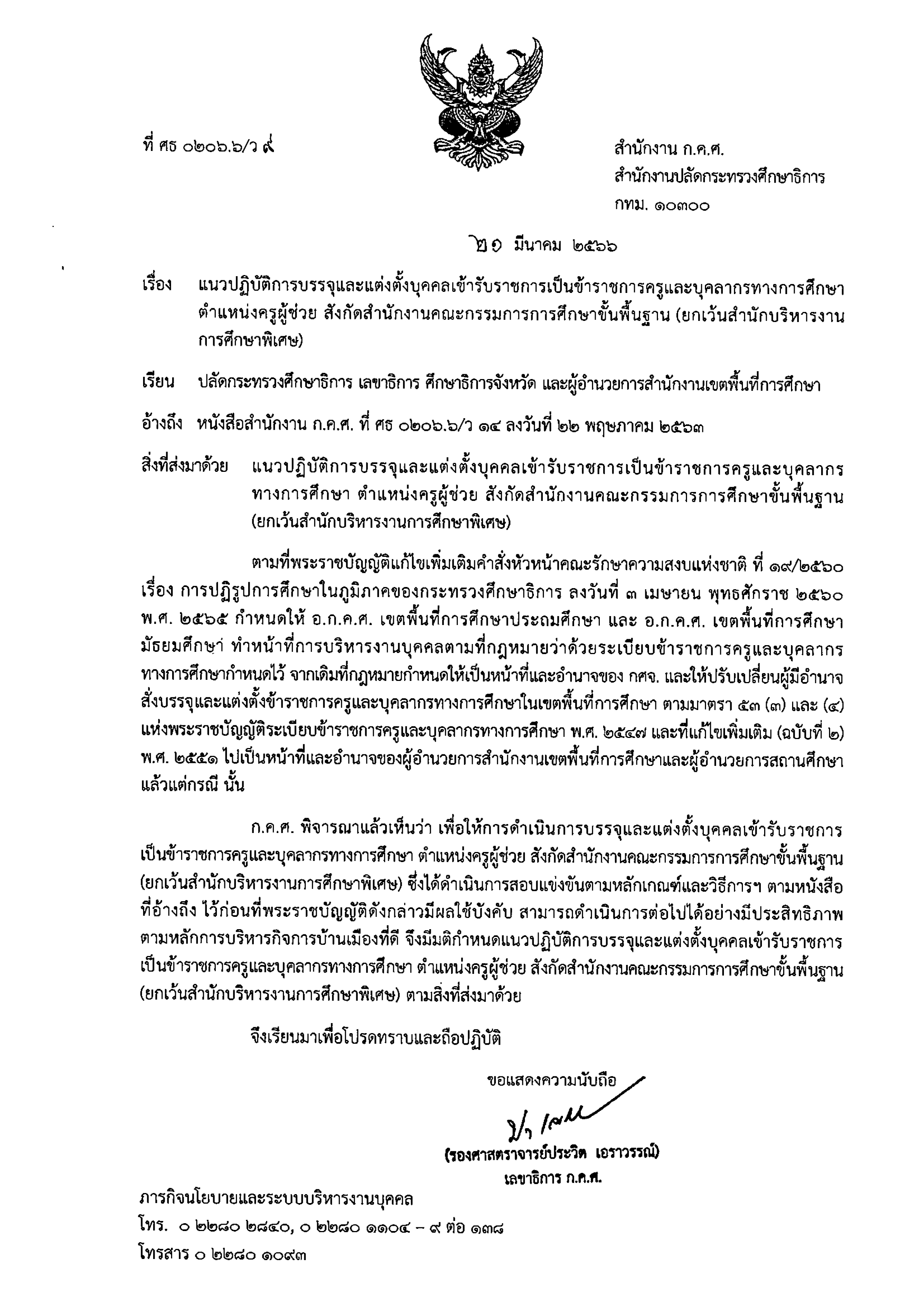 ว9/2566 แนวปฏิบัติการบรรจุและแต่งตั้งบุคคลเข้ารับราชการเป็นข้าราชการครูและบุคลากรทางการศึกษา ตำแหน่งครูผู้ช่วย สังกัดสำนักงานคณะกรรมการการศึกษาขั้นพื้นฐาน (ยกเว้นสำนักบริหารงานการศึกษาพิเศษ)
