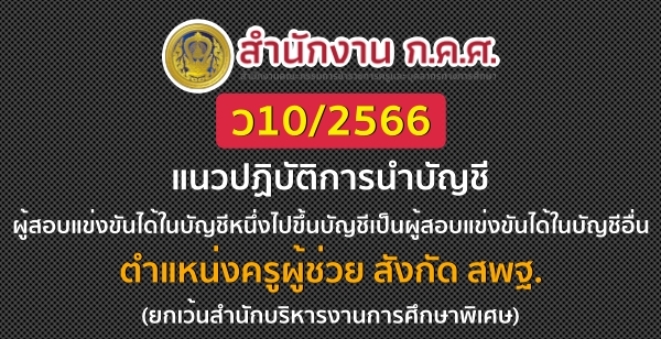 ว10/2566 แนวปฏิบัติการนำบัญชีผู้สอบแข่งขันได้ในบัญชีหนึ่งไปขึ้นบัญชีเป็นผู้สอบแข่งขันได้ในบัญชีอื่น ตำแหน่งครูผู้ช่วย สังกัดสำนักงานคณะกรรมการการศึกษาขั้นพื้นฐาน (ยกเว้นสำนักบริหารงานการศึกษาพิเศษ)
