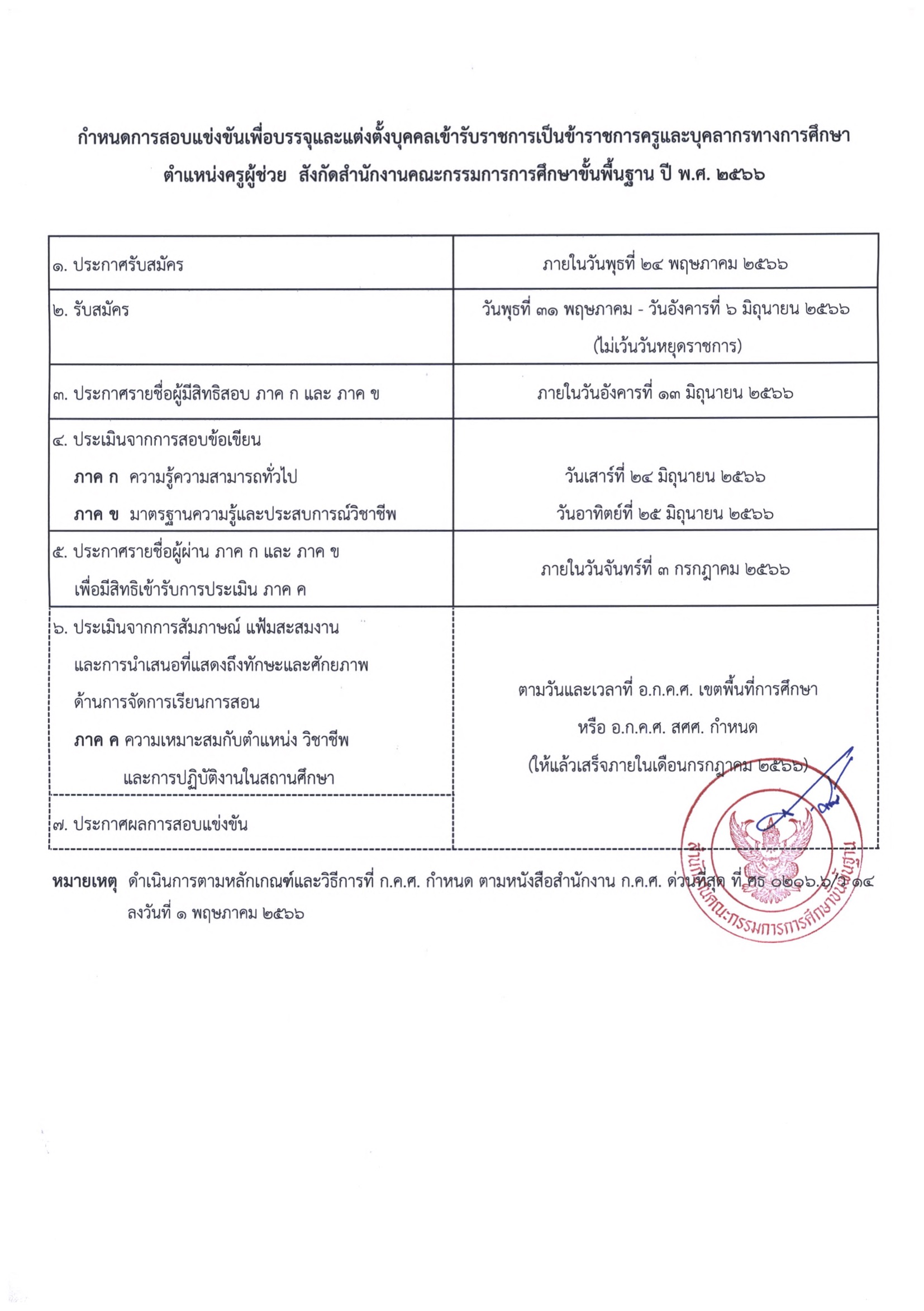 สำนักงานคณะกรรมการการศึกษาขั้นพื้นฐานพิจารณาแล้ว เพื่อให้เป็นไปตามหลักเกณฑ์และวิธีการ ที่ ก.ค.ศ. กำหนด จึงได้กำหนดการสอบแข่งขันเพื่อบรรจุและแต่งตั้งบุคคลเข้ารับราชการเป็นข้าราชการครู และบุคลากรทางการศึกษา ตำแหน่งครูผู้ช่วย สังกัดสำนักงานคณะกรรมการการศึกษาขั้นพื้นฐาน ปี พ.ศ.๒๕๖๖ รายละเอียดตามสิ่งที่ส่งมาด้วย