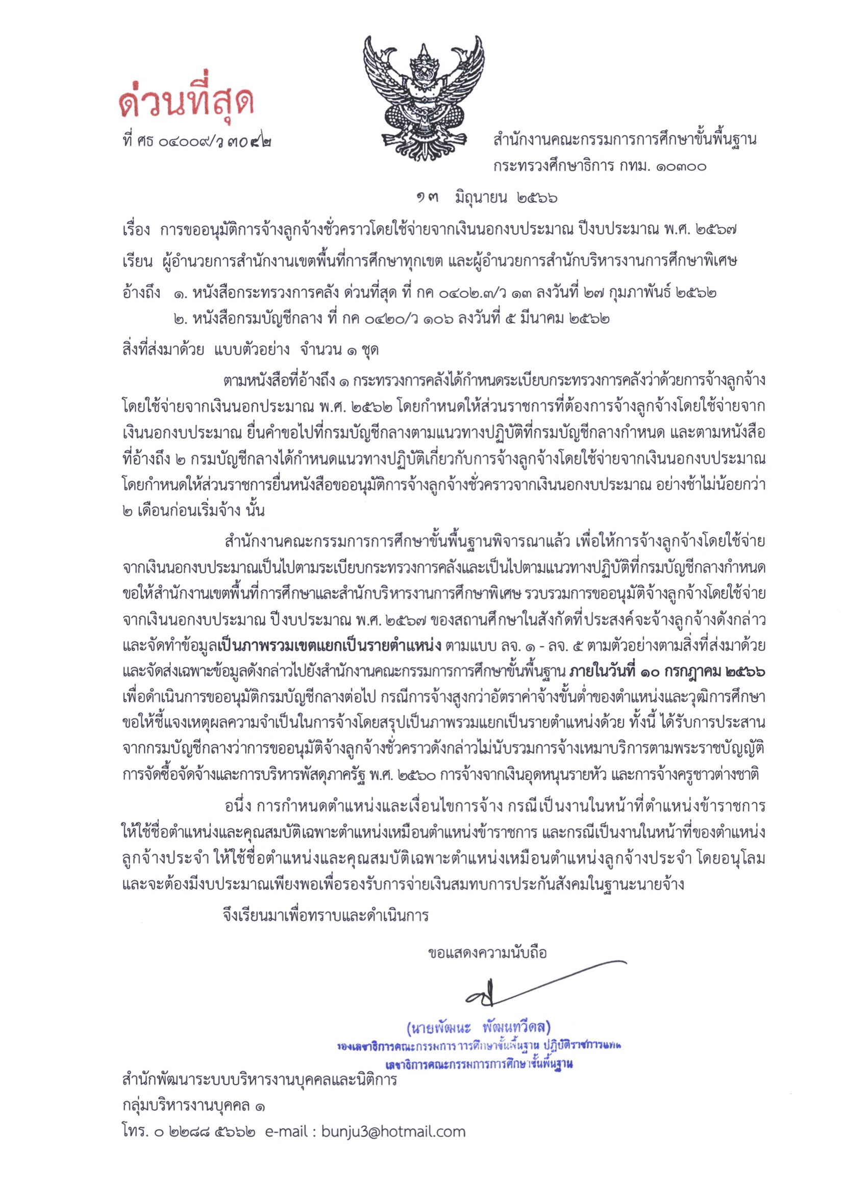 สำนักงานคณะกรรมการการศึกษาขั้นพื้นฐานพิจารณาแล้ว เพื่อให้การจ้างลูกจ้างโดยใช้จ่าย จากเงินนอกงบประมาณป็นไปตามระเบียบกระทรวงการคลังและเป็นไปตามแนวทางปฏิบัติที่กรมบัญชีกลางกำหนด ขอให้สำนักงานเขตพื้นที่การศึกษาและสำนักบริหารงานการศึกษาพิเศษ รวบรวมการขออนุมัติจ้างลูกจ้างโดยใช้จ่าย จากเงินนอกงบประมาณ ปีงบประมาณ พ.ศ. 2567 ของสถานศึกษาในสังกัดที่ประสงค์จะจ้างลูกจ้างดังกล่าว และจัดทำข้อมูลเป็นภาพรวมเขตแยกเป็นรายตำแหน่ง ตามแบบ ลจ. 1 - ลจ. 5 ตามตัวอย่างตามสิ่งที่ส่งมาด้วย และจัดส่งเฉพาะข้อมูลดังกล่าวไปยังสำนักงานคณะกรรมการการศึกษาขั้นพื้นฐาน ภายในวันที่ 10 กรกฎาคม 2566 เพื่อดำเนินการขออนุมัติกรมบัญชีกลางต่อไป กรณีการจ้างสูงกว่าอัตราค่าจ้างขั้นต่ำของตำแหน่งและวุฒิการศึกษา ขอให้ชี้แจงเหตุผลความจำเป็นในการจ้างโดยสรุปเป็นภาพรวมแยกเป็นรายตำแหน่งด้วย ทั้งนี้ ได้รับการประสาน จากกรมบัญชีกลางว่าการขออนุมัติจ้างลูกจ้างชั่วคราวดังกล่าวไม่นับรวมการจ้างเหมาบริการตามพระราชบัญญัติ การจัดซื้อจัดจ้างและการบริหารพัสดุภาครัฐ พ.ศ. 2560 การจ้างจากเงินอุดหนุนรายหัว และการจ้างครูชาวต่างชาติ