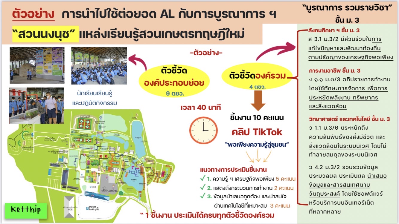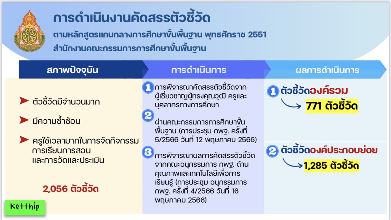 “ทั้งนี้ ตัวชี้วัดยังคงเดิม เพียงแต่เน้น 771 องค์รวม เพื่อใช้วัดผลประเมินผล ส่วน 1,285 ย่อยใช้จัดกิจกรรมเสริมทักษะ เพื่อให้เกิดรวมแล้ววัดผล เพื่อลดภาระของทุกตัวชี้วัดต้องมีร่องรอยหลักฐานการเก็บคะแนน เพียงแต่เป็นการส่งเสริมจัดกิจกรรมแล้วเกิดตัวชี้วัดองค์รวมซึ่งง่ายต่อการทำใบงาน ซึ่งจะลดภาระครูที่ไม่ต้องวัดผลทุกตัวชี้วัด แต่ใช้การจัดกิจกรรมหรือทักษะ และเน้นย้ำองค์รวมเพื่อมุ่งเน้นให้นักเรียนเกิดการเรียนรู้ที่บรรลุตามมาตรฐานตัวชี้วัด และส่งผลให้ง่ายต่อการบูรณาการหลายวิชา โดยใช้แหล่งเรียนรู้เป็นห้องเรียนรวมรายวิชา และเกิดคุณลักษณะและมีสมรรถนะของผู้เรียนตามหลักสูตร ฯ ได้ง่ายขึ้น รวมถึงนักเรียนจะมีเวลาในการ Create จึงขอให้ผู้บริหารและศึกษานิเทศก์ ได้สร้างความเข้าใจ และร่วมคิดพาครูทำให้เห็นจริงถึงการปฏิบัติ เป็นพี่เลี้ยงครูอย่างกัลยาณมิตร เพื่อให้ครูมีความสุขในการออกแบบการเรียนรู้ และมีเวลาเติมเต็มนักเรียนให้ถึงพร้อมศักยภาพ ซึ่งจะส่งผลให้นักเรียนมีเวลาเหลือในการพัฒนาตนเองตามความชอบ ความถนัด และความสนใจของตนเอง บรรลุผลตาม KPI ของนายอัมพร พินะสา เลขาธิการ กพฐ. ทั้งด้านวิชาการ ดนตรี กีฬา ทักษะอาชีพ และทักษะชีวิต” รองเลขาธิการ กพฐ. กล่าว