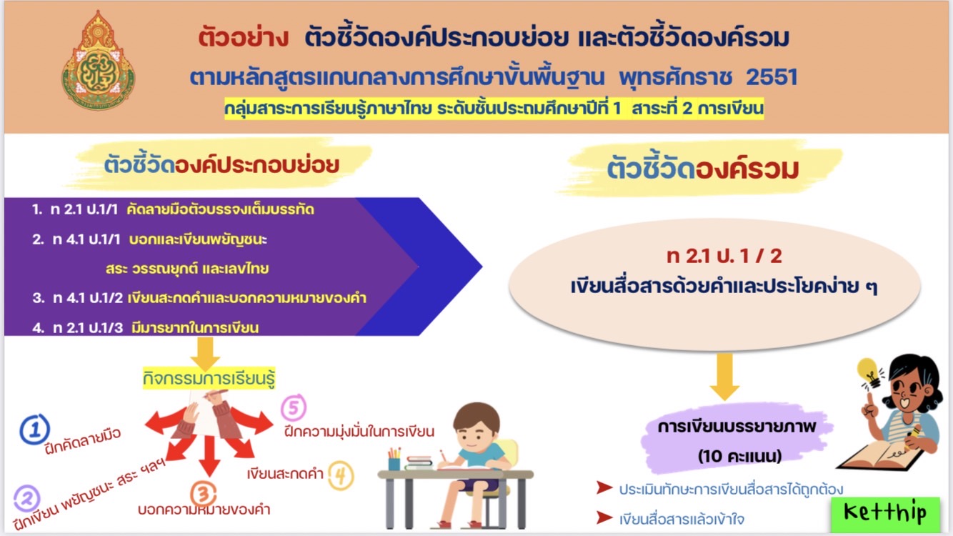นอกจากนั้น การจัดกลุ่มประเภทตัวชี้วัดในครั้งนี้ก็เพื่อต้องการให้มีความชัดเจนในการวัดและประเมินผล ที่เกิดจากการจัดกิจกรรมการเรียนรู้ตามหลักสูตรแกนกลางการศึกษาขั้นพื้นฐาน พ.ศ. 2551 ตามมาตรฐานการเรียนรู้ และตัวชี้วัด อาทิ ตัวชี้วัดองค์รวม “เขียนสื่อสารด้วยคำและประโยคง่ายๆ” ที่นักเรียนต้องผ่านการวัดผลนั้น จะต้องเกิดจากการเรียนรู้ด้วยกิจกรรมผ่านตัวชี้วัดองค์ประกอบย่อย ทั้งตัวชี้วัดการคัดลายมือตัวบรรจงเต็มบรรทัด ตัวชี้วัดการบอกและเขียนพยัญชนะ สระ วรรณยุกต์ และเลขไทย ตัวชี้วัดการเขียนสะกดคำและบอกความหมายของคำ ตัวชี้วัดการมีมารยาทในการเขียน ซึ่งผ่านกระบวนการเรียนรู้ที่หลากหลาย แต่เมื่อผ่านกระบวนการจัดกิจกรรมการเรียนรู้แล้วสิ่งที่ต้องการวัดนักเรียน คือการเขียนสื่อสารด้วยคำและประโยคง่ายๆ จึงเป็นการวัดด้วยชิ้นงานเดียว แล้วครอบคลุมบรรลุตัวชี้วัดทั้ง 5 ตัวชี้วัด ซึ่งทำให้เรารู้ว่า นักเรียนเรียนรู้อะไร และทำอะไรได้ รวมถึงเกิดการเรียนรู้อย่างมีความหมายและปฏิบัติด้วยตัวเองได้