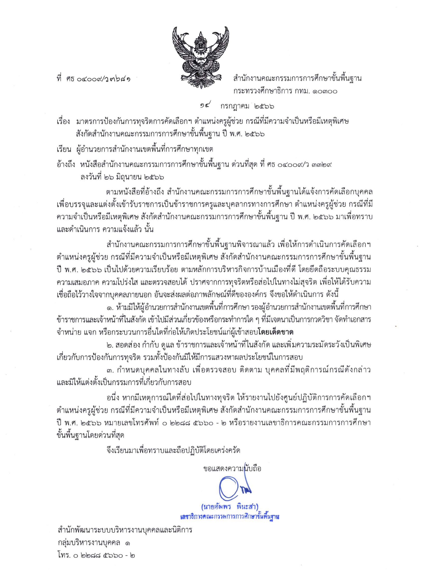 สำนักงานคณะกรรมการการศึกษาขั้นพื้นฐานพิจารณาแล้ว เพื่อให้การดำเนินการคัดเลือกฯ ตำแหน่งครูผู้ช่วย กรณีที่มีความจำเป็นหรือมีเหตุพิเศษ สังกัดสำนักงานคณะกรรมการการศึกษาขั้นพื้นฐาน ปี พ.ศ. 2566 เป็นไปด้วยความเรียบร้อย ตามหลักการบริหารกิจการบ้านเมืองที่ ดี โดยยึดถือระบบคุณธรรม ความเสมอภาค ความโปร่งใส และตรวจสอบได้ ปราศจากการทุจริตหรือส่อไปในทางไม่สุจริต เพื่อให้ได้รับความ เชื่อถือไว้วางใจจากบุคคลภายนอก อันจะส่งผลต่อภาพลักษณ์ที่ดีขององค์กร จึงขอให้ดำเนินการ ดังนี้