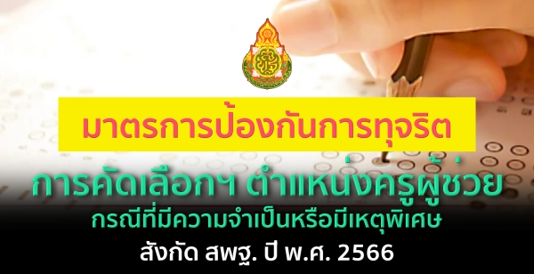 อนึ่ง หากมีเหตุการณ์ใดที่ส่อไปในทางทุจริต ให้รายงานไปยังศูนย์ปฏิบัติการการคัดเลือกฯ ตำแหน่งครูผู้ช่วย กรณีที่มีความจำเป็นหรือมีเหตุพิเศษ สังกัดสำนักงานคณะกรรมการการศึกษาขั้นพื้นฐาน ปี พ.ศ. 2566 หมายเลขโทรศัพท์ ㆍ 0 2288 5660-2 หรือร้ายงานเลขาธิการคณะกรรมการการศึกษา ขั้นพื้นฐานโดยด่วนที่สุด