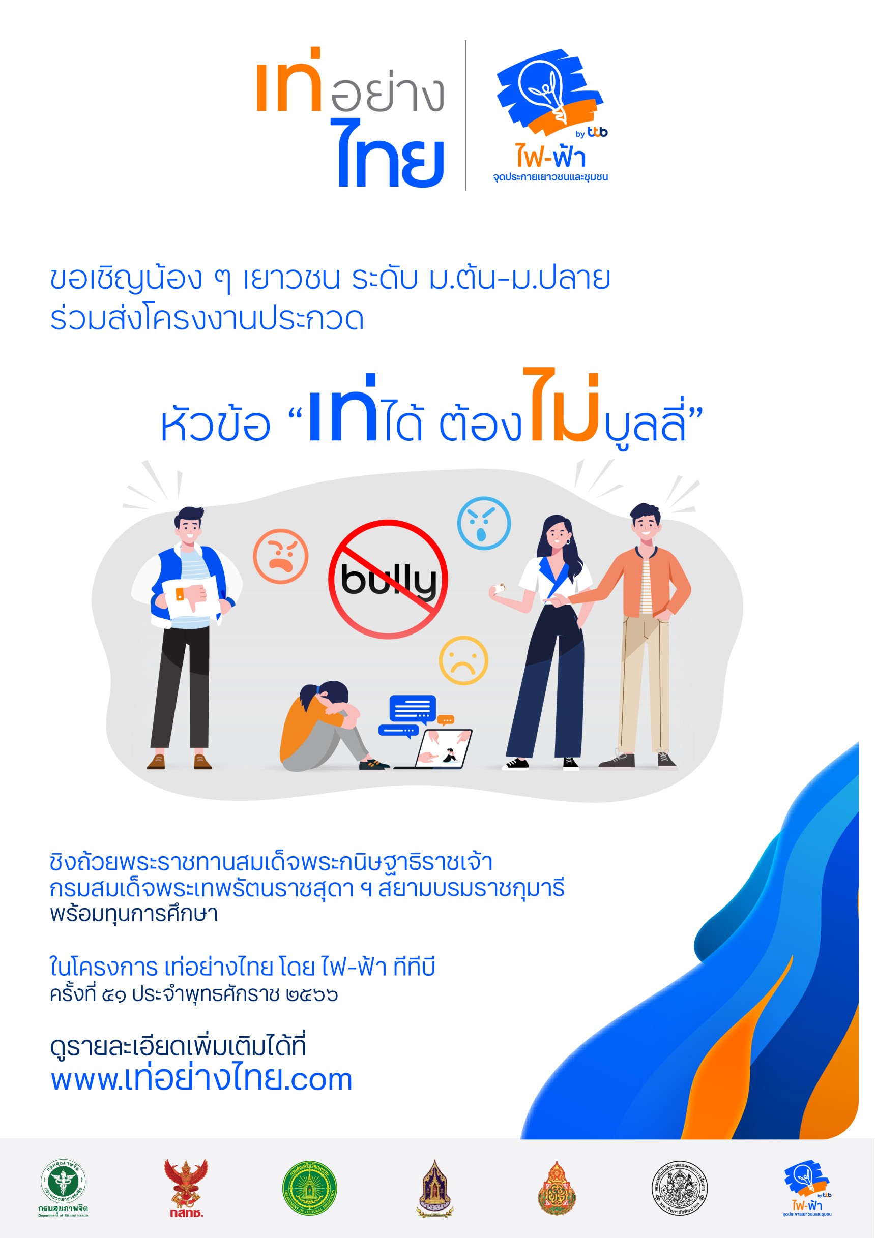 สำหรับคุณครูและอาจารย์ ที่ต้องการพัฒนาศักยภาพของนักเรียน และร่วมเป็นส่วนสำคัญในการแก้ปัญหาการบูลลี่ที่เกิดขึ้นภายในโรงเรียน สามารถส่งน้อง ๆ เยาวชน สมัครเข้าร่วมประกวดโครงการ “เท่อย่างไทย โดย ไฟ-ฟ้า ทีทีบี” กับโครงงานประกวดหัวข้อ “เท่ได้...ต้องไม่บูลลี่” ประจำปี 2566 ได้ตั้งแต่วันนี้ - วันที่ 24 สิงหาคม 2566 ศึกษาดูรายละเอียดและขั้นตอนการสมัครได้ที่ www.เท่อย่างไทย.com หรือ สอบถามรายละเอียดเพิ่มเติม โทร 06 2070 0088, 06 2070 0099