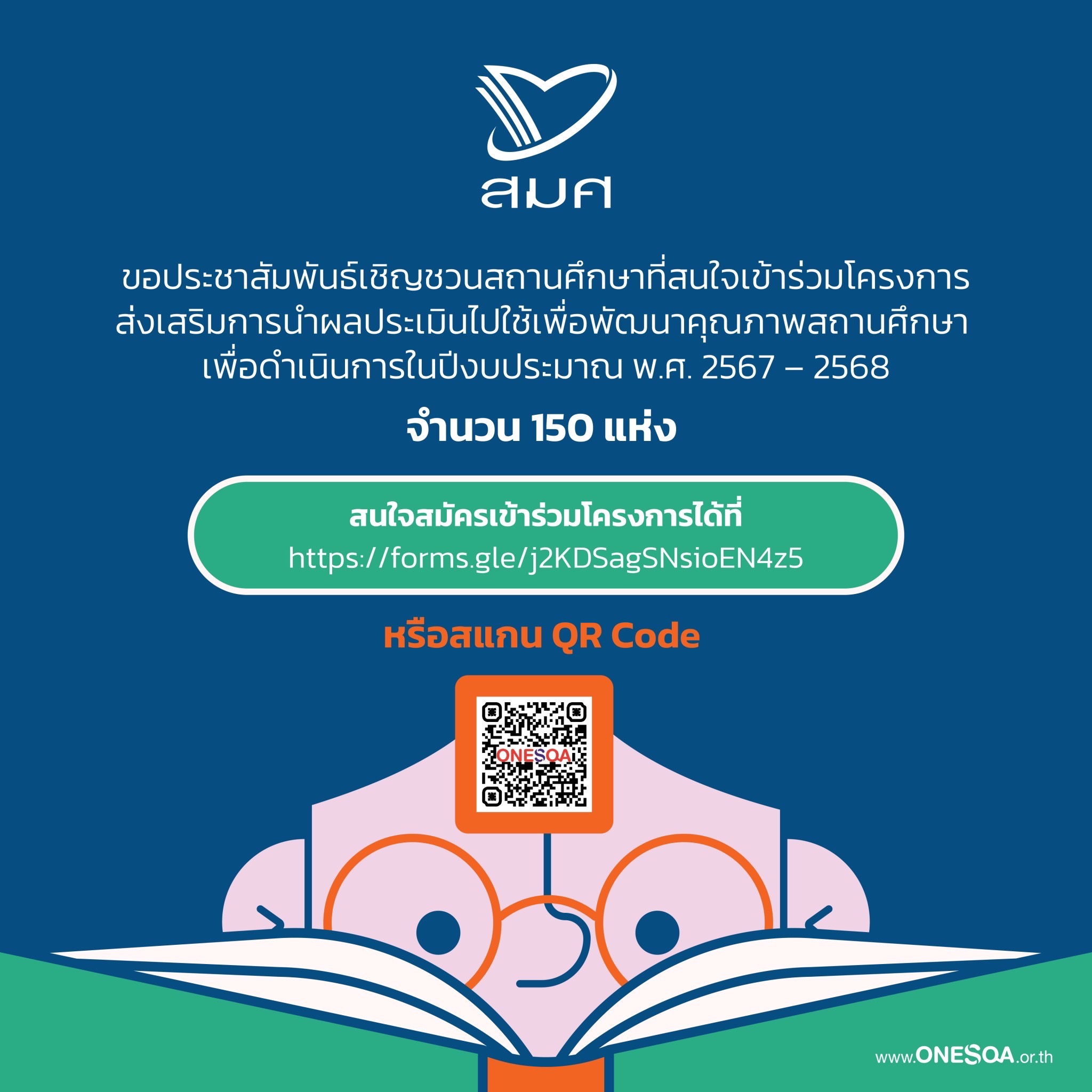 ทั้งนี้ สมศ. ขอประชาสัมพันธ์เชิญชวนสถานศึกษาที่สนใจสมัครเข้าร่วมโครงการส่งเสริมการนำผลประเมินไปใช้เพื่อพัฒนาคุณภาพสถานศึกษา เพื่อดำเนินการในปีงบประมาณ พ.ศ. 2567 – 2568 ได้ตั้งแต่วันที่ 18 สิงหาคม – 30 กันยายน 2566 สามารถสอบถามข้อมูลเพิ่มเติมได้ที่ 02-216-3955 ต่อ 152 ดร.นันทา กล่าวทิ้งท้าย