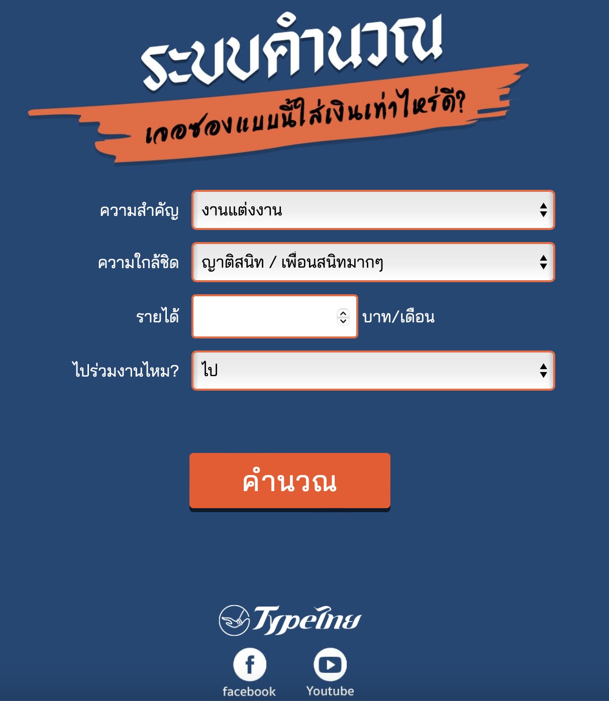 วันนี้จึงขอแนะนำ โปรแกรม ‘คำนวณเงินใส่ซอง’ ที่ TypeThai ได้พัฒนาขึ้นมาแก้ Pain Point ที่เกิดขึ้น ซึ่ง TypeThai ผู้ผลิตคอนเทนต์ที่หยิบเรื่องราวไทย ๆ หรือประเด็นที่อยู่ในกระแสความสนใจของผู้คนมานำเสนอ เกิดสะดุดกับคำถามที่ว่า ‘ต้องใส่ซองเท่าไร’ ซึ่งเป็นประเด็นที่เกิดขึ้นซ้ำ ๆ จึงสนใจแล้วนำมาเป็นโจทย์สำหรับหาทางออกของปัญหา ซึ่งการได้มาซึ่งข้อมูลเพื่อมากำหนดสูตรในการคำนวณนั้น ทางทีมได้ทำรีเสิร์ช ด้วยการไปพูดคุยกับคนใกล้ชิดว่า หากต้องใส่ซองงานใดงานหนึ่ง เหตุผลหรือหลักในการตัดสินใจจะคำนึงถึงปัจจัยอะไรบ้าง
