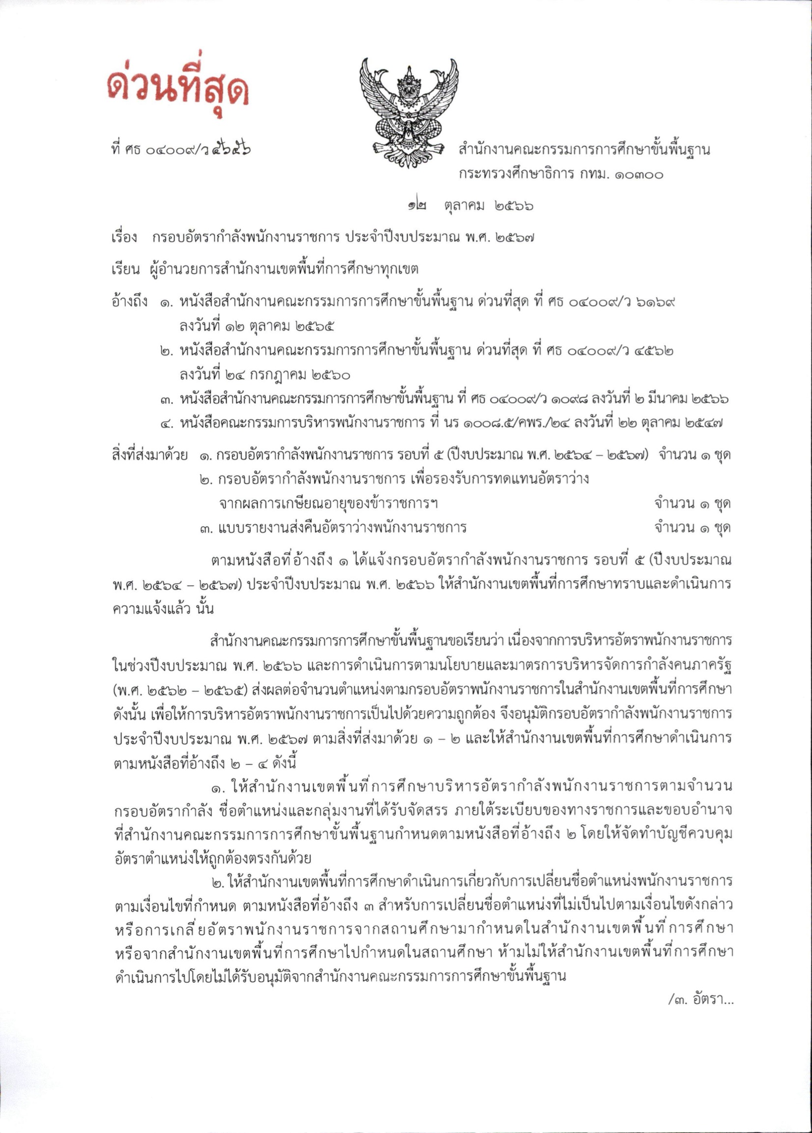 ด่วนที่สุด ที่ ศธ 04009/ว 5656 เรื่อง กรอบอัตรากำลังพนักงานราชการ ประจำปีงบประมาณ พ.ศ. 2567 (ลงวันที่ 12 ตุลาคม 2566)