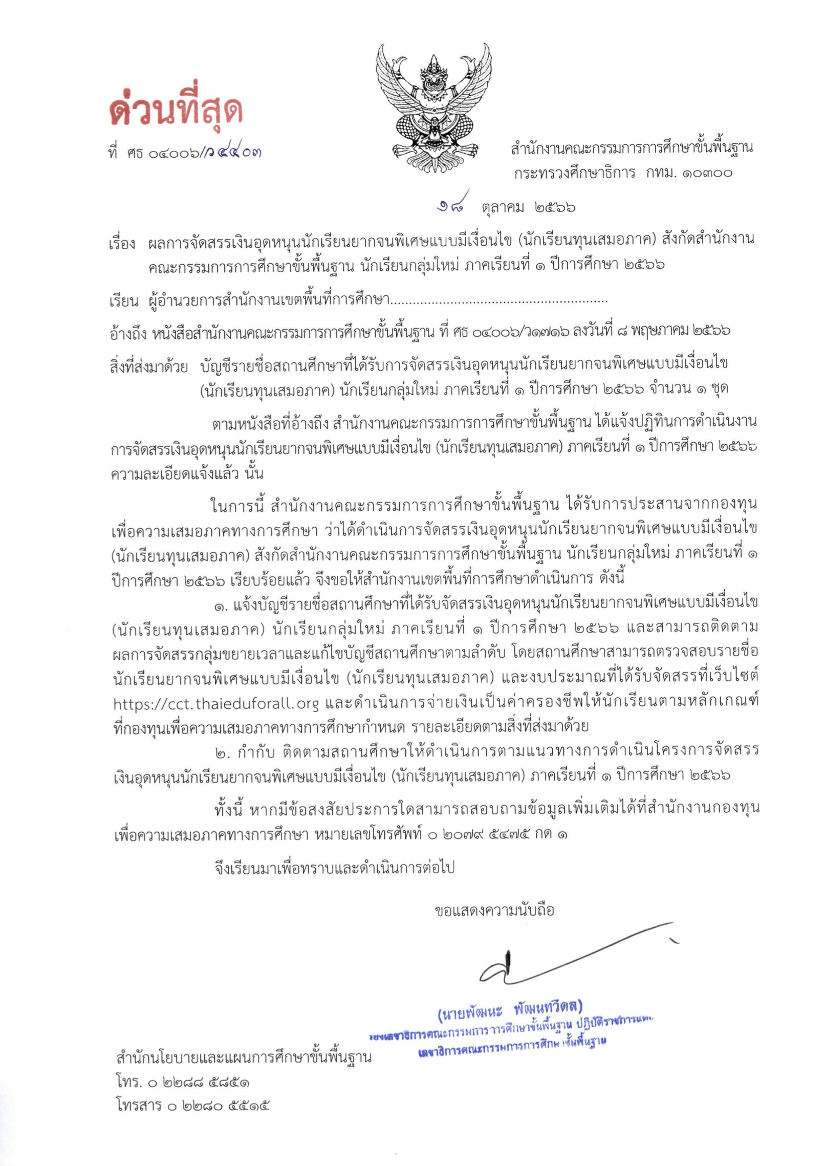 ผลการจัดสรรเงินอุดหนุนนักเรียนยากจนพิเศษแบบมีเงื่อนไข (นักเรียนทุนเสมอภาค) สังกัดสำนักงานคณะกรรมการการศึกษาขั้นพื้นฐาน นักเรียนกลุ่มใหม่ ภาคเรียนที่ 1 ปีการศึกษา 2566