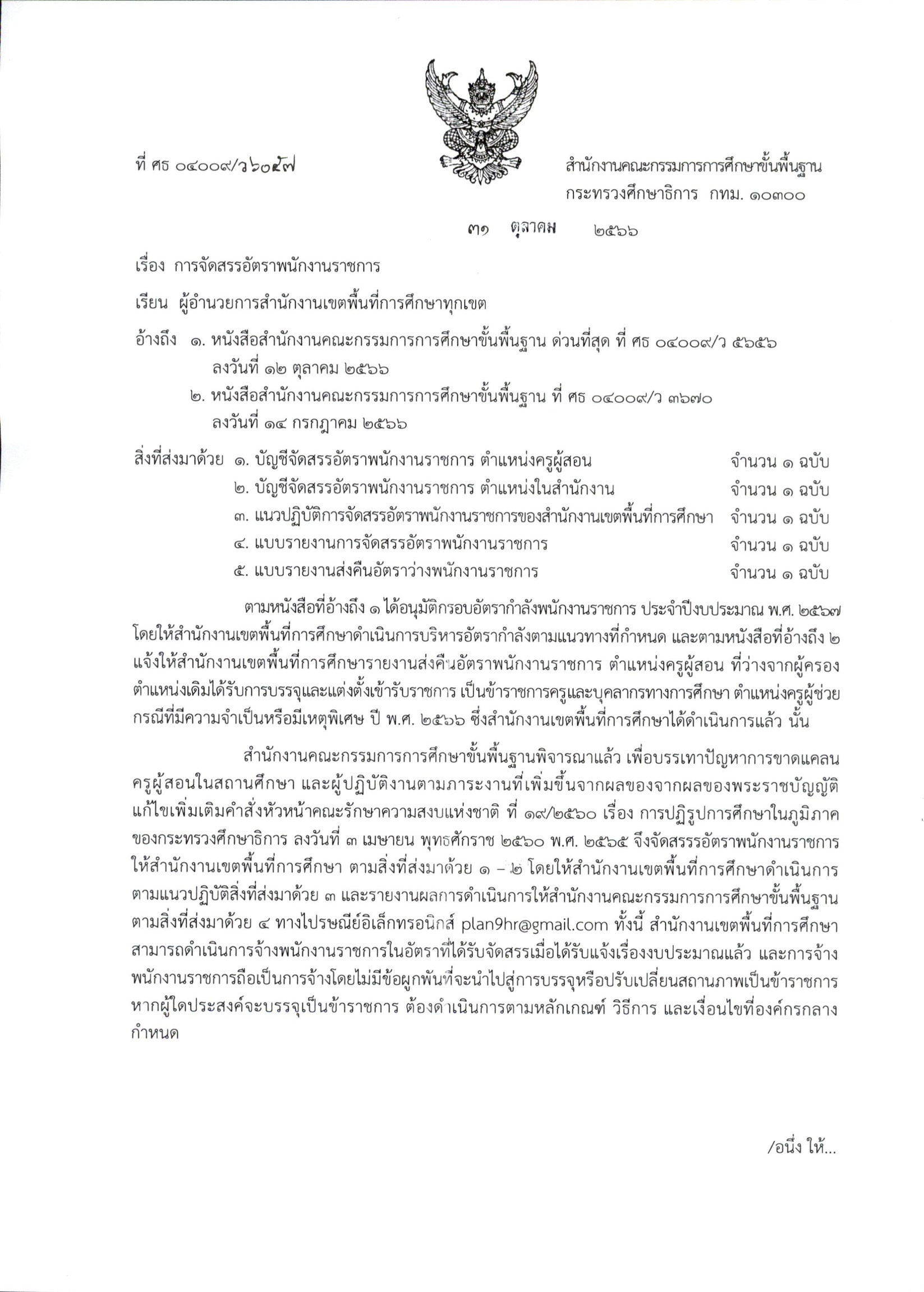 ศธ 04009/ว 6057 การจัดสรรพนักงานราชการ (ลงวันที่ 31 ตุลาคม 2566)ศธ040096057การจัดสรรพนักงานราชการ(ลงวันที่31ตุลาคม2566)