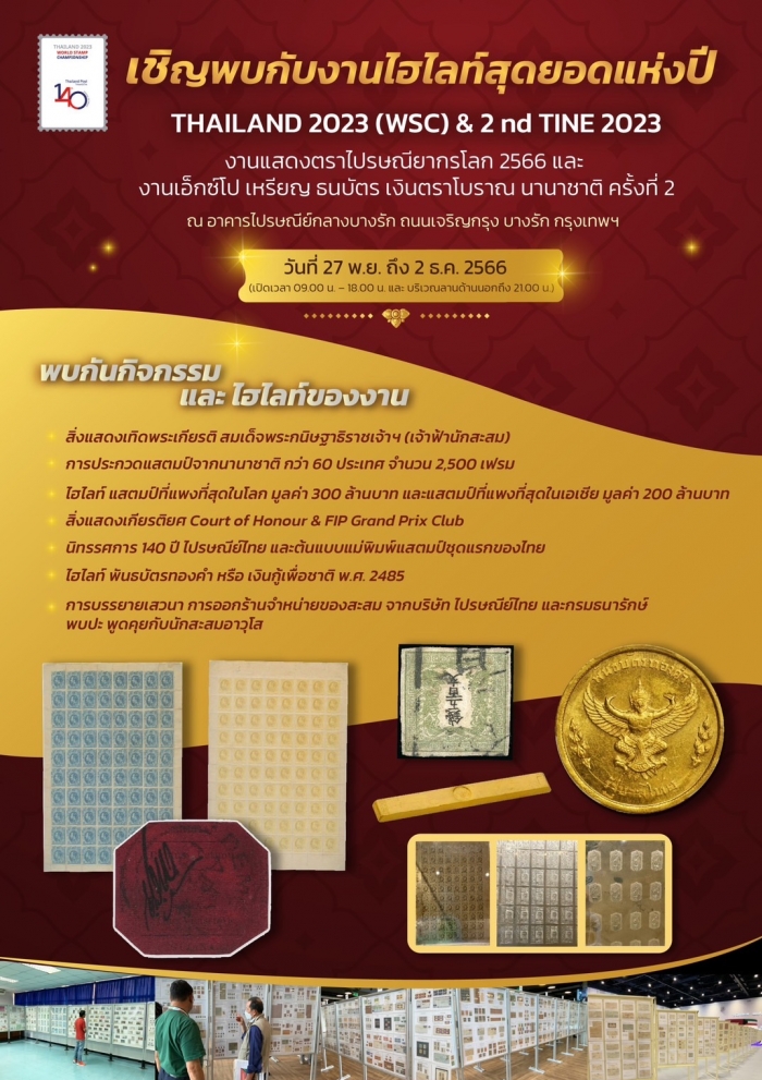 สมาคมนักสะสมตราไปรษณียากรแห่งประเทศไทย ในพระราชูปถัมภ์ สมเด็จพระเทพรัตนราชสุดาฯ สยามบรมราชกุมารี (ส.ต.ท.) ได้รับเกียรติให้เป็นเจ้าภาพจัด งานแสดงตราไปรษณียากรโลก / THAILAND2023 World Stamp Championship Exhibition (WSC) ในการจัดประกวดแสตมป์อย่างยิ่งใหญ่ มีคอลเลคชั่นตราไปรษณียากรจากทั่วโลกกว่า 60 ประเทศ กว่า 500 ผลงานเข้าร่วม และมีนิทรรศการที่น่าสนใจ รวมทั้งการออกร้านจำหน่ายแสตมป์และสิ่งสะสมจากไปรษณีย์ชาติต่างๆ และร้านค้าชั้นนำทั่วโลกกว่า 60 บูท