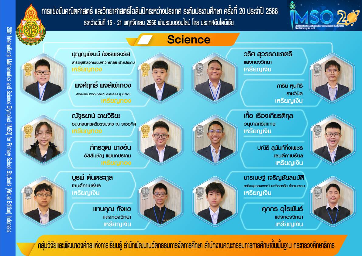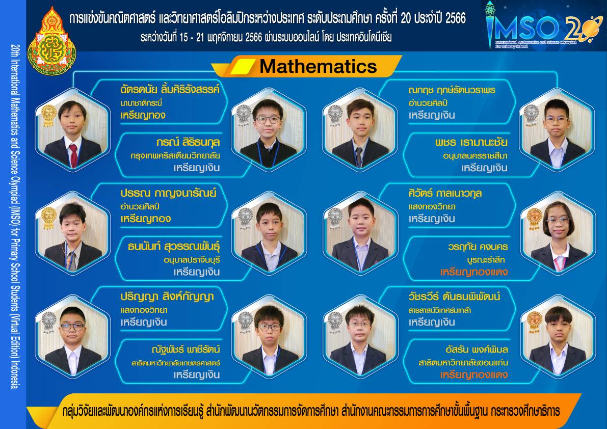 เด็กไทยสุดเจ๋ง คว้า 24 เหรียญ จากการเข้าร่วมแข่งขันคณิตศาสตร์และวิทยาศาสตร์ โอลิมปิก ระหว่างประเทศ ระดับประถมศึกษา ครั้งที่ 20 ประจำปี พ.ศ. ๒๕๖๖ : 20th International Mathematics and Science Olympiad for Primary School Students (IMSO 2023) ผ่านระบบออนไลน์