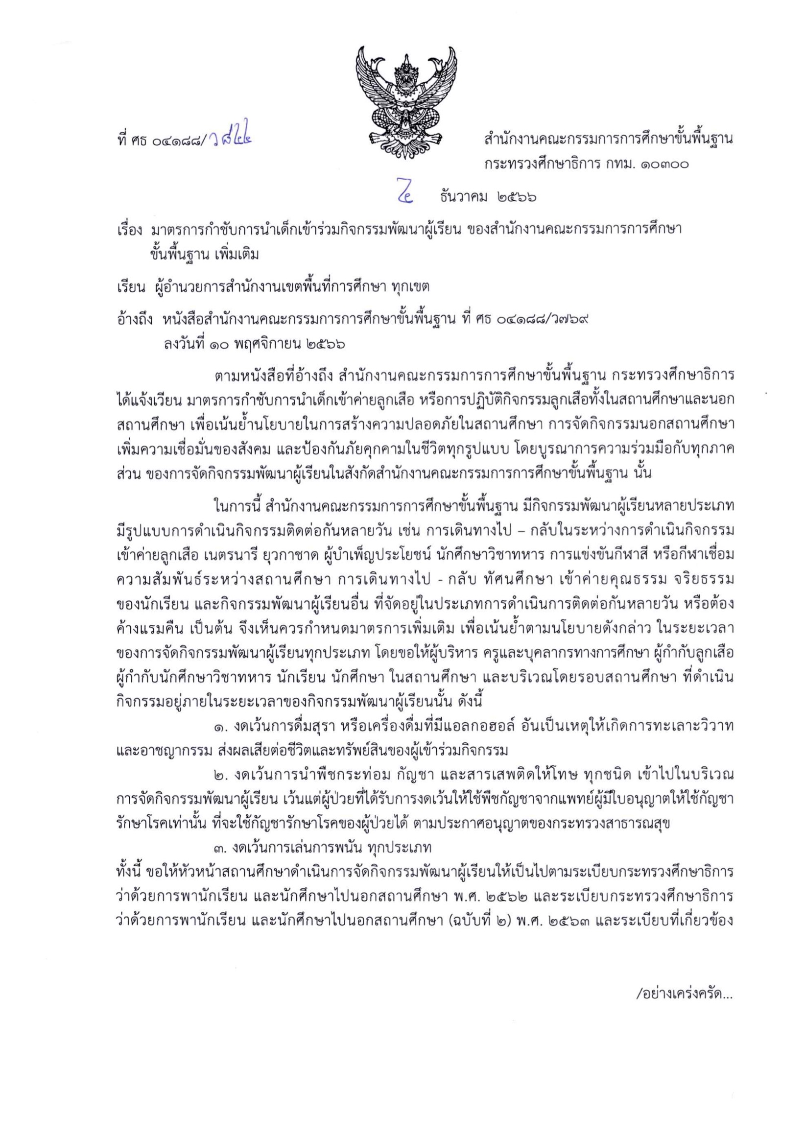 ในการนี้ สำนักงานคณะกรรมการการศึกษาขั้นพื้นฐาน มีกิจกรรมพัฒนาผู้เรียนหลายประเภท มีรูปแบบการดำเนินกิจกรรมติดต่อกันหลายวัน เช่น การเดินทางไป - กลับในระหว่างการดำเนินกิจกรรม เข้าค่ายลูกเสือ เนตรนารี ยุวกาชาด ผู้บำเพ็ญประโยชน์ นักศึกษาวิชาทหาร การแข่งขันกีฬาสี หรือกีฬาเชื่อม ความสัมพันธ์ระหว่างสถานศึกษา การเดินทางไป - กลับ ทัศนศึกษา เข้าค่ายคุณธรรม จริยธรรม ของนักเรียน และกิจกรรมพัฒนาผู้เรียนอื่น ที่จัดอยู่ในประเภทการดำเนินการติดต่อกันหลายวัน หรือต้อง ค้างแรมคืน เป็นต้น จึงเห็นควรกำหนดมาตรการเพิ่มเติม เพื่อเน้นย้ำตามนโยบายดังกล่าว ในระยะเวลา ของการจัดกิจกรรมพัฒนาผู้เรียนทุกประเภท โดยขอให้ผู้บริหาร ครูและบุคลากรทางการศึกษา ผู้กำกับลูกเสือ ผู้กำกับนักศึกษาวิชาทหาร นักเรียน นักศึกษา ในสถานศึกษา และบริเวณโดยรอบสถานศึกษา ที่ดำเนิน กิจกรรมอยู่ภายในระยะเวลาของกิจกรรมพัฒนาผู้เรียนนั้น ดังนี้