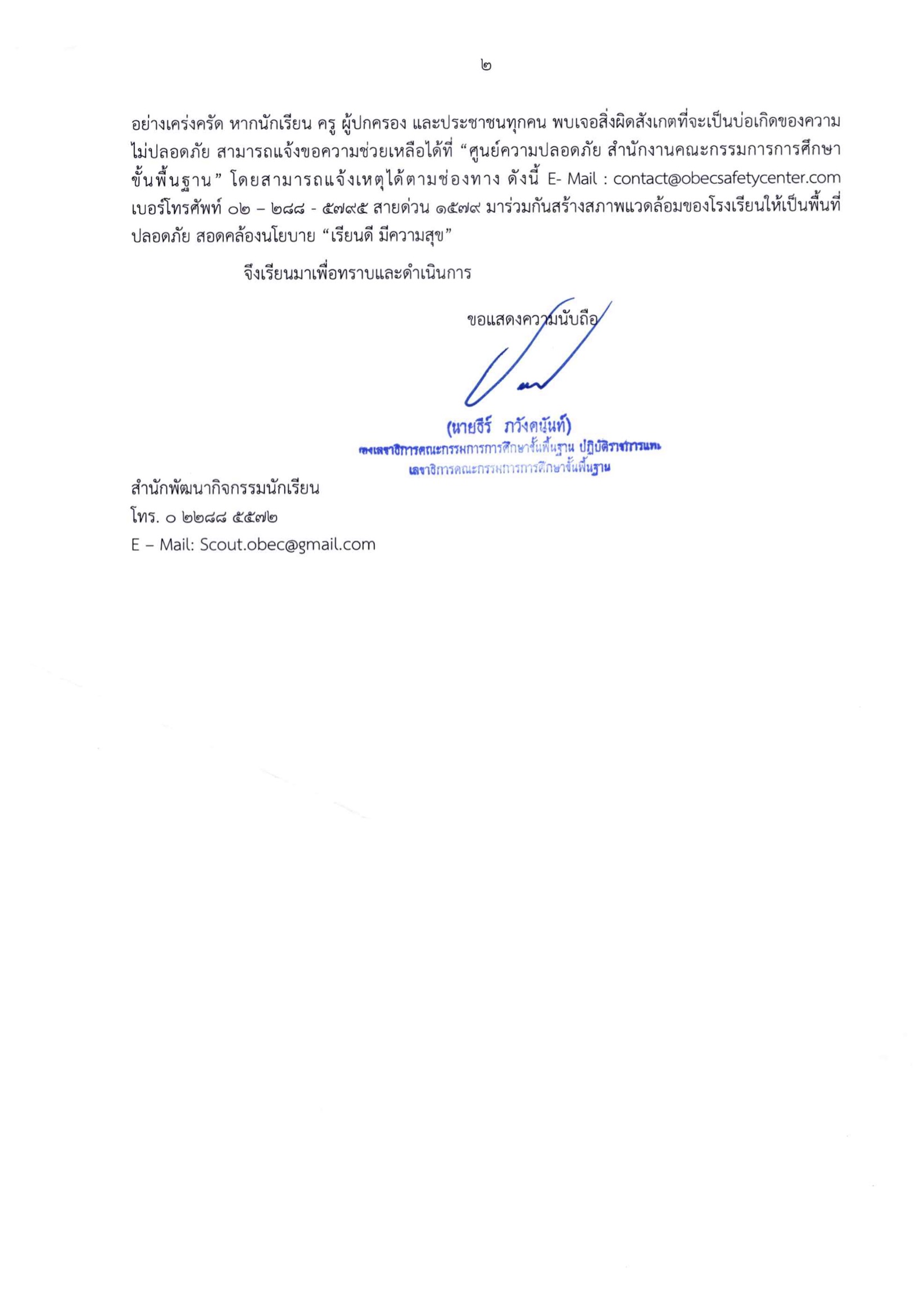 ทั้งนี้ ขอให้หัวหน้าสถานศึกษาดำเนินการจัดกิจกรรมพัฒนาผู้เรียนให้เป็นไปตามระเบียบกระทรวงศึกษาธิการ ว่าด้วยการพานักเรียน และนักศึกษาไปนอกสถานศึกษา พ.ศ. ๒๕๖๒ และระเบียบกระทรวงศึกษาธิการ ว่าด้วยการพานักเรียน และนักศึกษาไปนอกสถานศึกษา (ฉบับที่ ๒) พ.ศ. ๒๕๖๓ และระเบียบที่เกี่ยวข้องอย่างเคร่งครัด หากนักเรียน ครู ผู้ปกครอง และประชาชนทุกคน พบเจอสิ่งผิดสังเกตที่จะเป็นบ่อเกิดของความ ไม่ปลอดภัย สามารถแจ้งขอความช่วยเหลือได้ที่ "ศูนย์ความปลอดภัย สำนักงานคณะกรรมการการศึกษา ขั้นพื้นฐาน" โดยสามารถแจ้งเหตุได้ทาง E- Mail : และโทรศัพท์ มาร่วมกันสร้างสภาพแวดล้อมของโรงเรียนให้เป็นพื้นที่ ปลอดภัย สอดคล้องนโยบาย "เรียนดี มีความสุข"