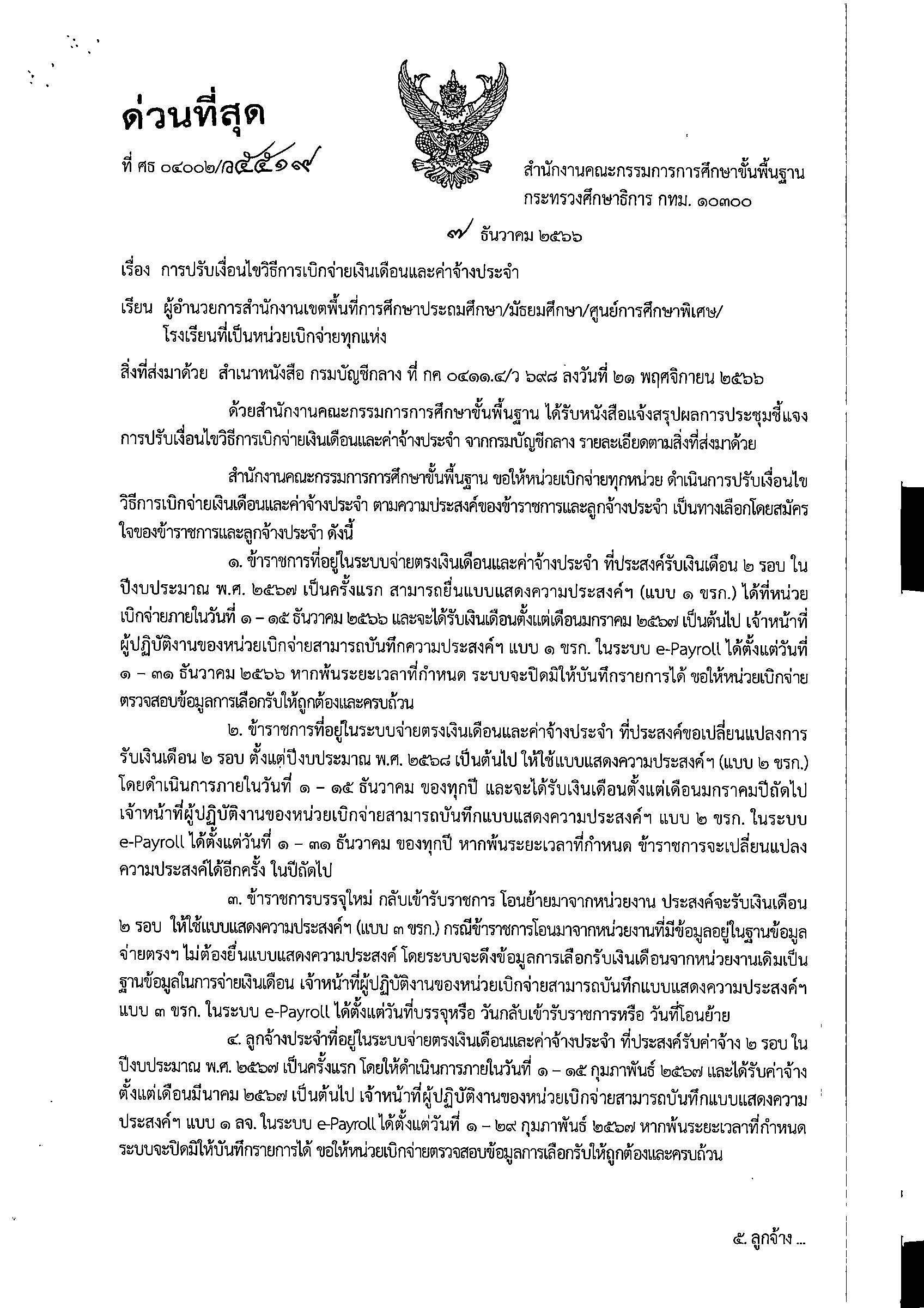 เมื่อวันที่ 7 ธ.ค. 2566 สำนักงานคณะกรรมการการศึกษาขั้นพื้นฐาน มีหนังสือ ด่วนที่สุด ที่ ศธ 04002/ว5519 แจ้งไปยังทุกเขต เรื่อง การปรับเงื่อนไขวิธีการเบิกจ่ายเงินเดือนและค่าจ้างประจำ 2 รอบ รายละเอียด ดังนี้