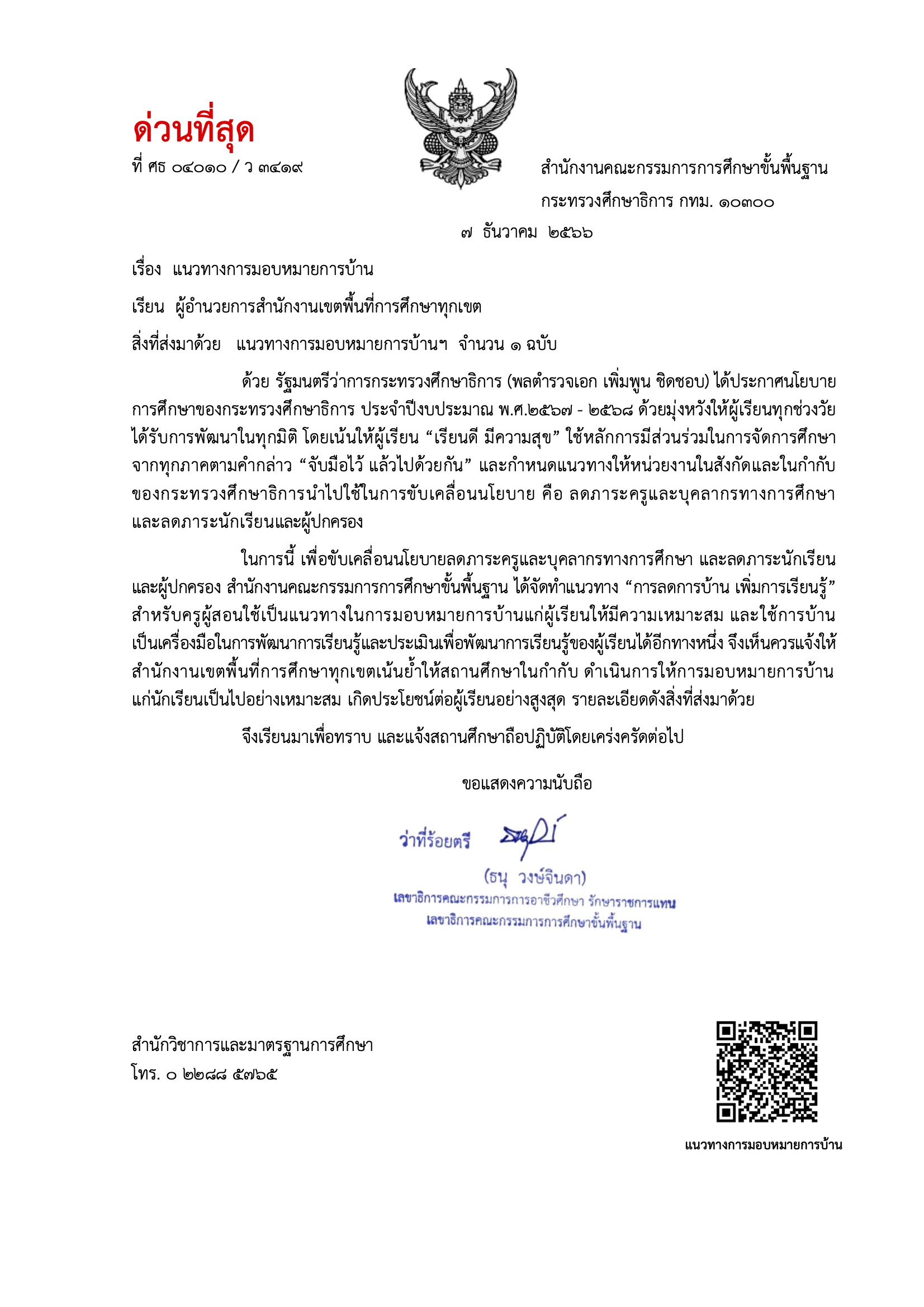 ในการนี้ เพื่อขับเคลื่อนนโยบายลดภาระครูและบุคลากรทางการศึกษา และลดภาระนักเรียน และผู้ปกครอง สำนักงานคณะกรรมการการศึกษาขั้นพื้นฐาน ได้จัดทำแนวทาง “การลดการบ้าน เพิ่มการเรียนรู้” สำหรับครูผู้สอนใช้เป็นแนวทางในการมอบหมายการบ้านแก่ผู้เรียนให้มีความเหมาะสม และใช้การบ้าน เป็นเครื่องมือในการพัฒนาการเรียนรู้และประเมินเพื่อพัฒนาการเรียนรู้ของผู้เรียนได้อีกทางหนึ่ง จึงเห็นควรแจ้งให้ สำนักงานเขตพื้นที่การศึกษาทุกเขตเน้นย้ำให้สถานศึกษาในกำกับ ดำเนินการให้การมอบหมายการบ้าน แก่นักเรียนเป็นไปอย่างเหมาะสม เกิดประโยชน์ต่อผู้เรียนอย่างสูงสุด รายละเอียดดังสิ่งที่ส่งมาด้วย