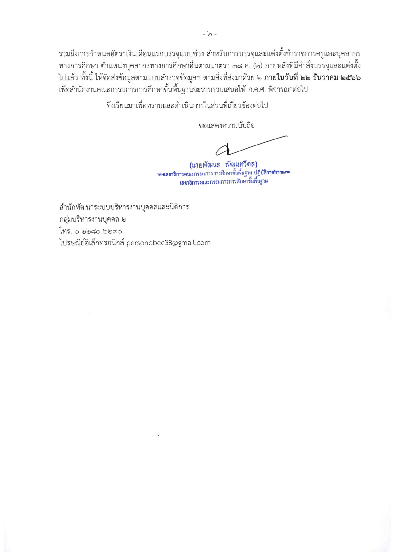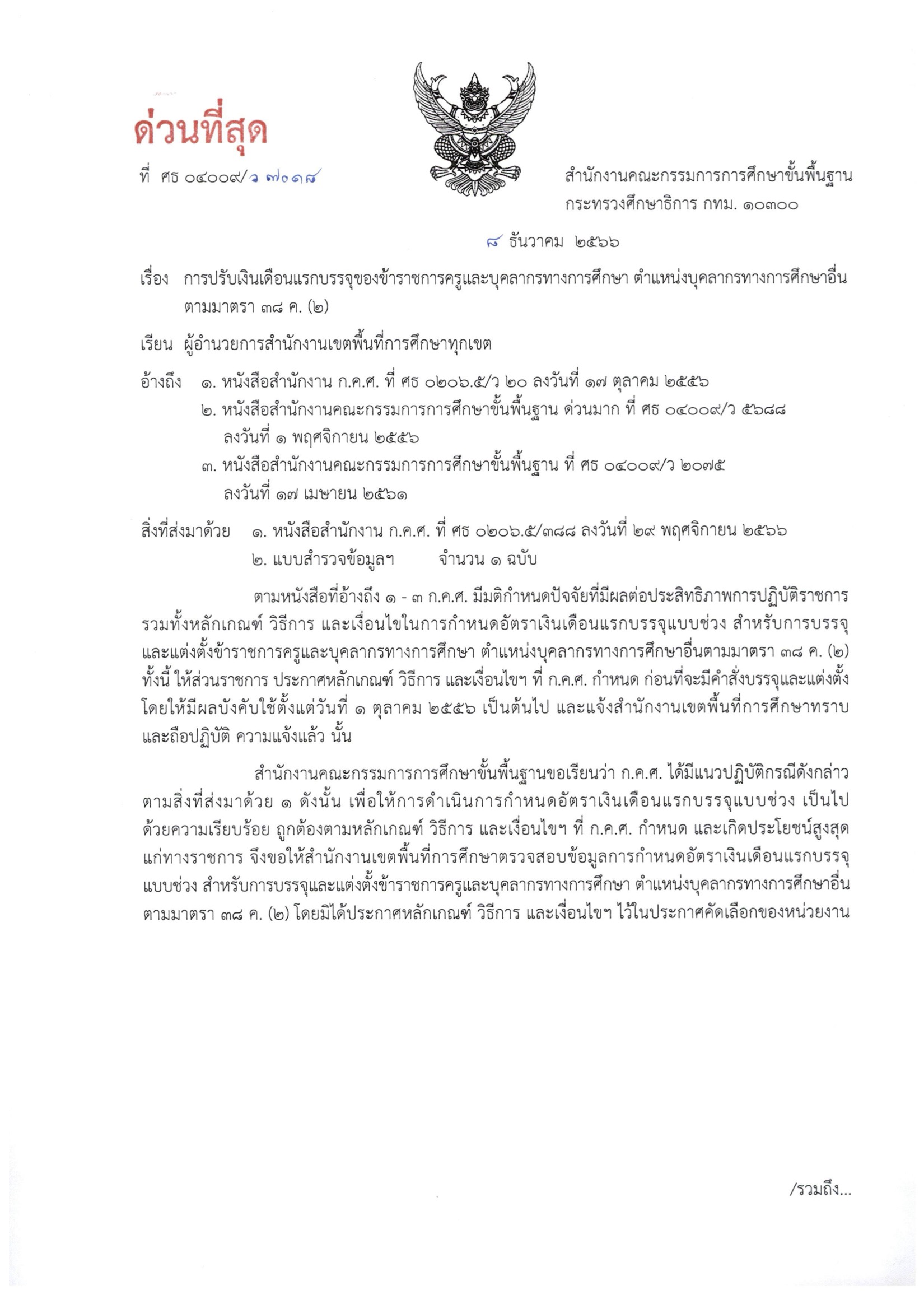 สำนักงานคณะกรรมการการศึกษาขั้นพื้นฐานขอเรียนว่า ก.ค.ศ. ได้มีแนวปฏิบัติกรณีดังกล่าว ตามสิ่งที่ส่งมาด้วย ๑ ดังนั้น เพื่อให้การดำเนินการกำหนดอัตราเงินเดือนแรกบรรจุแบบช่วง เป็นไป ด้วยความเรียบร้อย ถูกต้องตามหลักเกณฑ์ วิธีการ และเงื่อนไขฯ ที่ ก.ค.ศ. กำหนด และเกิดประโยชน์สูงสุด แก่ทางราชการ จึงขอให้สำนักงานเขตพื้นที่การศึกษาตรวจสอบข้อมูลการกำหนดอัตราเงินเดือนแรกบรรจุ แบบช่วง สำหรับการบรรจุและแต่งตั้งข้าราชการครูและบุคลากรทางการศึกษา ตำแหน่งบุคลากรทางการศึกษาอื่น ตามมาตรา ๓๘ ค. (๒) โดยมีได้ประกาศหลักเกณฑ์ วิธีการ และเงื่อนไขฯ ไว้ในประกาศคัดเลือกของหน่วยงานรวมถึงการกำหนดอัตราเงินเดือนแรกบรรจุแบบช่วง สำหรับการบรรจุและแต่งตั้งข้าราชการครูและบุคลากร ทางการศึกษา ตำแหน่งบุคลากรทางการศึกษาอื่นตามมาตรา ๓๘ ค. (๒) ภายหลังที่มีคำสั่งบรรจุและแต่งตั้ง ไปแล้ว ทั้งนี้ ให้จัดส่งข้อมูลตามแบบสำรวจข้อมูลฯ ตามสิ่งที่ส่งมาด้วย ๒ ภายในวันที่ ๒๒ ธันวาคม ๒๕๖๖ เพื่อสำนักงานคณะกรรมการการศึกษาขั้นพื้นฐานจะรวบรวมเสนอให้ ก.ค.ศ. พิจารณาต่อไป