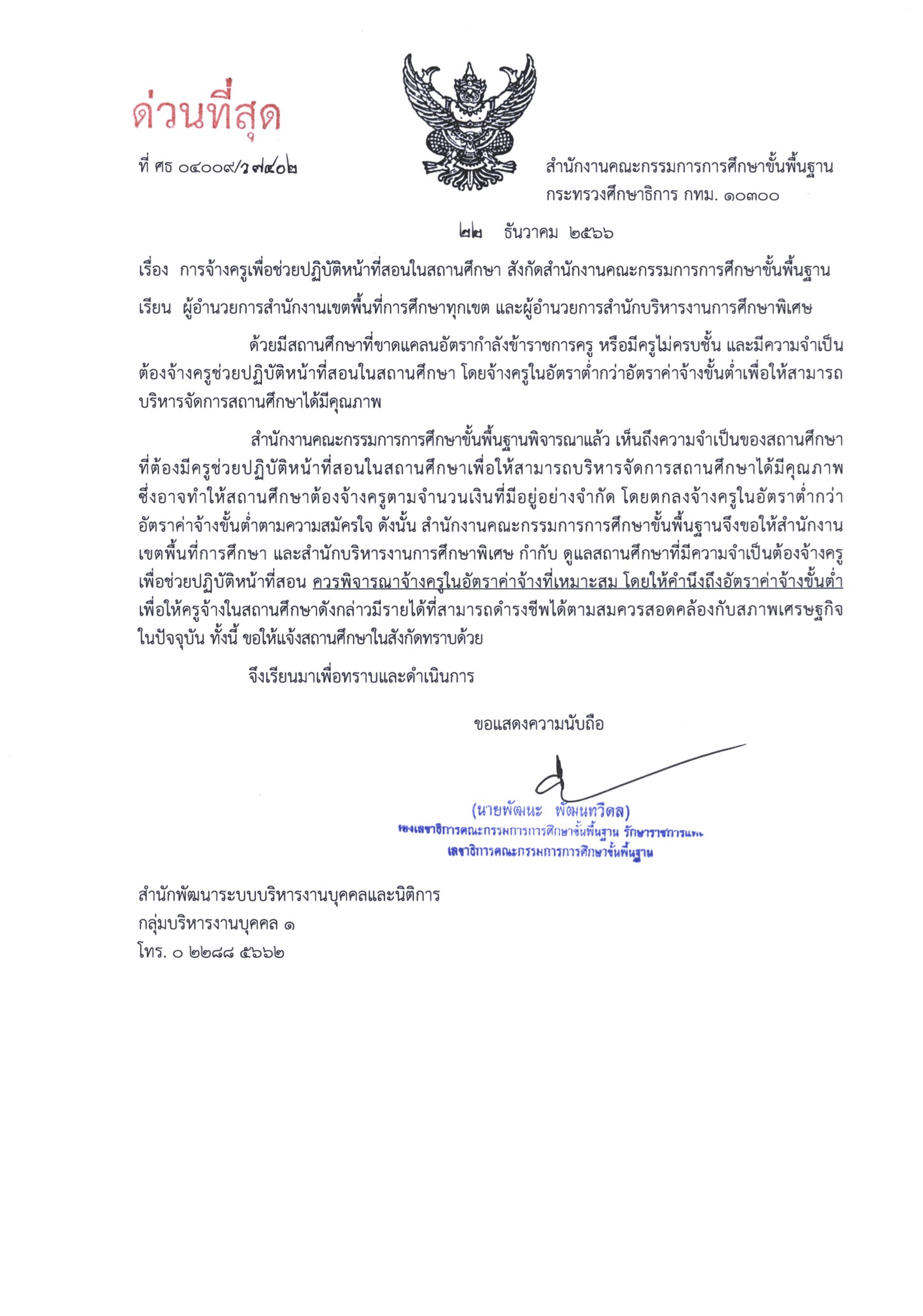 ด่วนที่สุด สำนักงานคณะกรรมการการศึกษาขั้นพื้นฐาน มีหนังสือ ที่ ศธ 04009/ว 7402 ลงวันที่ 22 ธค 2566 เรื่อง การจ้างครูเพื่อช่วยปฏิบัติหน้าที่สอนในสถานศึกษา สังกัดสำนักงานคณะกรรมการการศึกษาขั้นพื้นฐาน