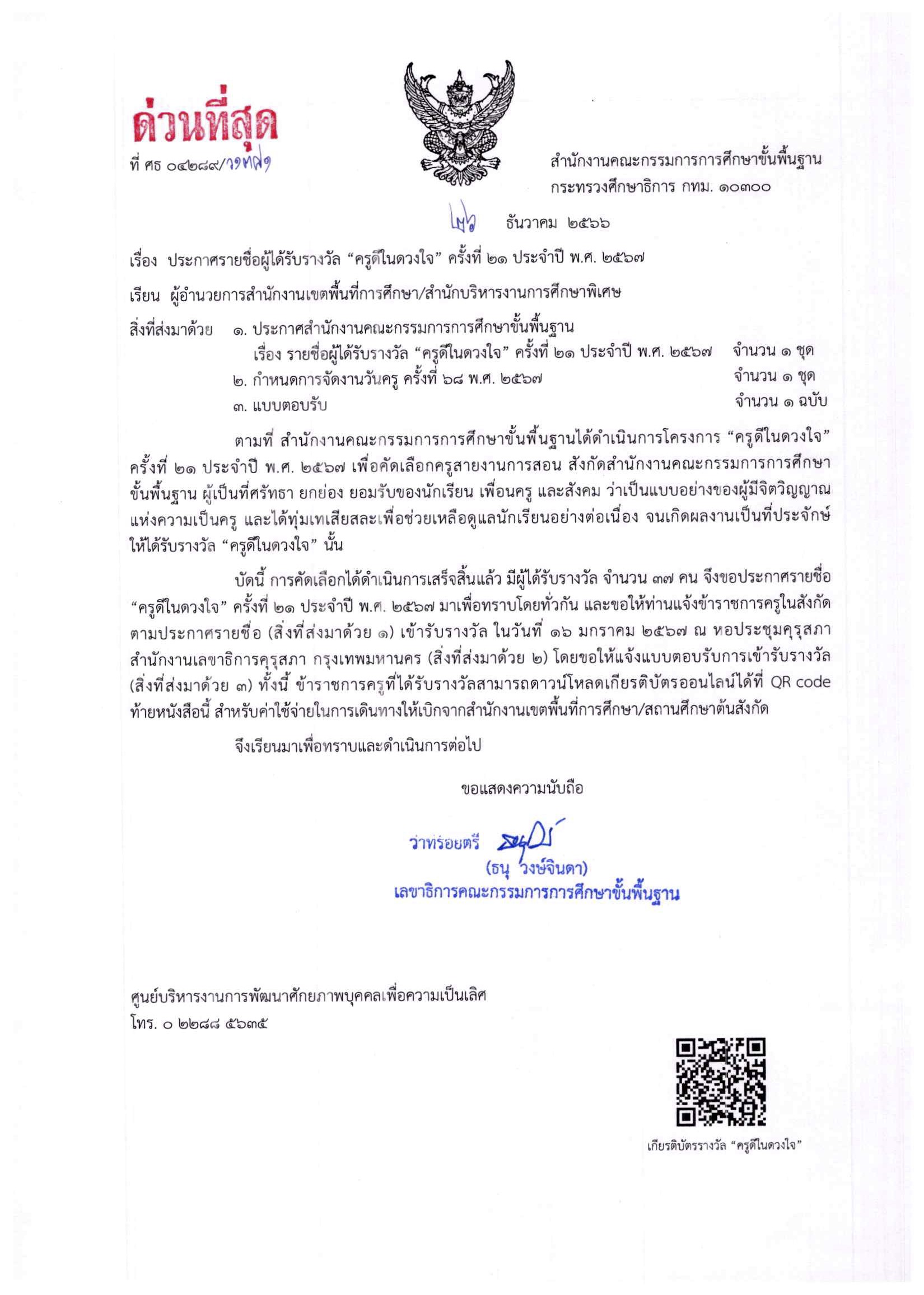 บัดนี้ การคัดเลือกได้ดำเนินการเสร็จสิ้นแล้ว มีผู้ได้รับรางวัล จำนวน ๓๗ คน จึงขอประกาศรายชื่อ "ครูดีในดวงใจ" ครั้งที่ ๒๑ ประจำปี พ.ศ. ๒๕๖๗ มาเพื่อทราบโดยทั่วกัน และขอให้ท่านแจ้งข้าราชการครูในสังกัด ตามประกาศรายชื่อ เข้ารับรางวัล ในวันที่ ๑๖ มกราคม ๒๕๖๗ ณ หอประชุมคุรุสภา สำนักงานเลขาธิการคุรุสภา กรุงเทพมหานคร โดยขอให้แจ้งแบบตอบรับการเข้ารับรางวัล ทั้งนี้ ข้าราชการครูที่ได้รับรางวัลสามารถดาวน์โหลดเกียรติบัตรออนไลน์ได้ที่ QR code ท้ายหนังสือนี้ สำหรับค่าใช้จ่ายในการเดินทางให้เบิกจากสำนักงานเขตพื้นที่การศึกษา/สถนศึกษาต้นสังกัด