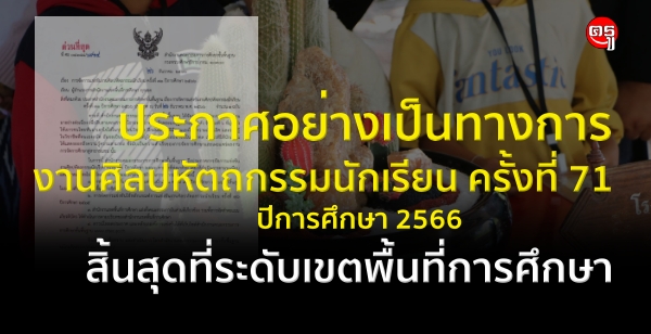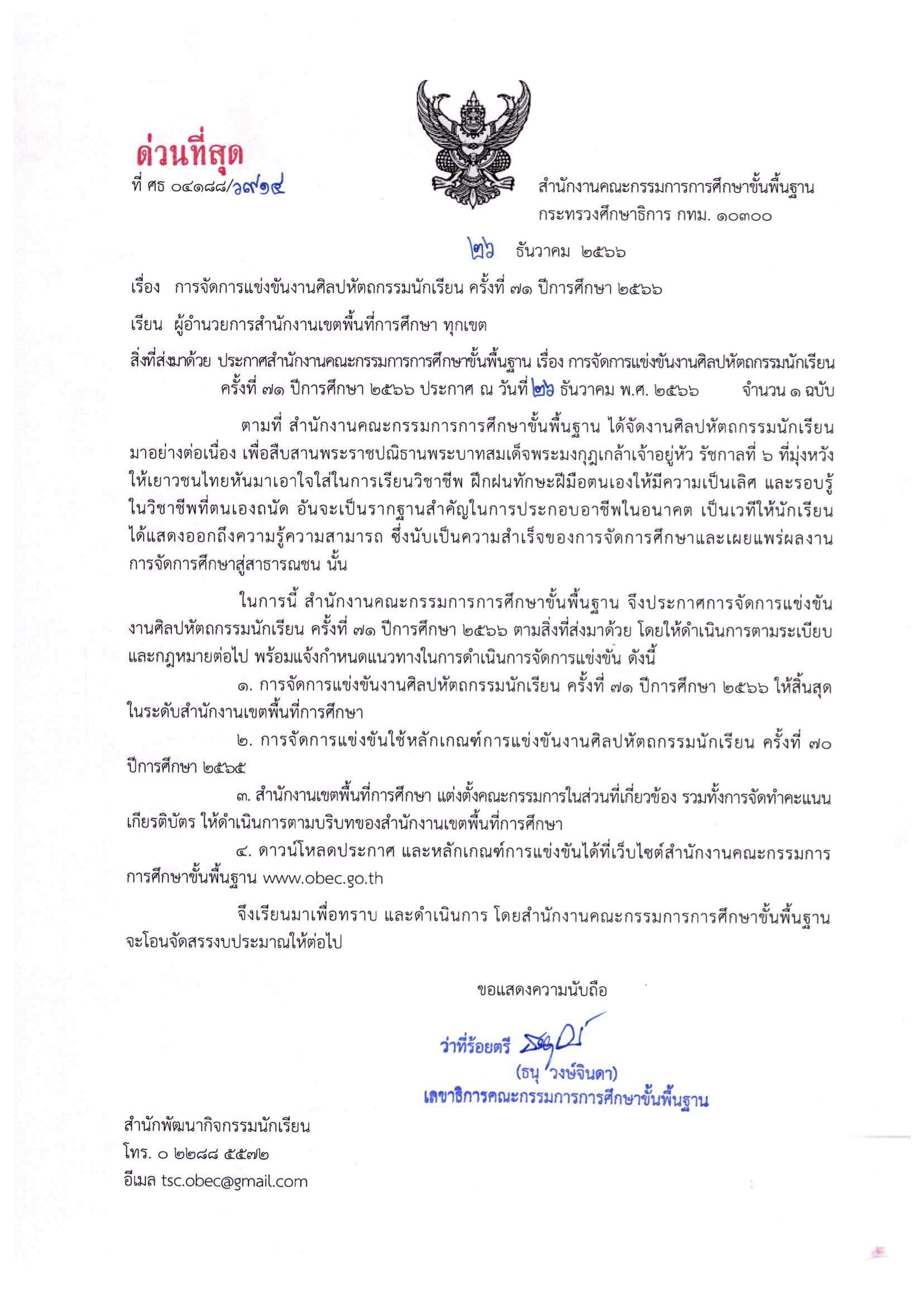 สำนักงานคณะกรรมการการศึกษาขั้นพื้นฐาน มีหนังสือ ด่วนที่สุด ที่ ศธ 04188/ว914 เรื่อง การจัดการแข่งขันงานศิลปหัตถกรรมนักเรียน ครั้งที่ 71 ปีการศึกษา 2566 ลงวันที่ 26 ธันวาคม 2566 ความว่า