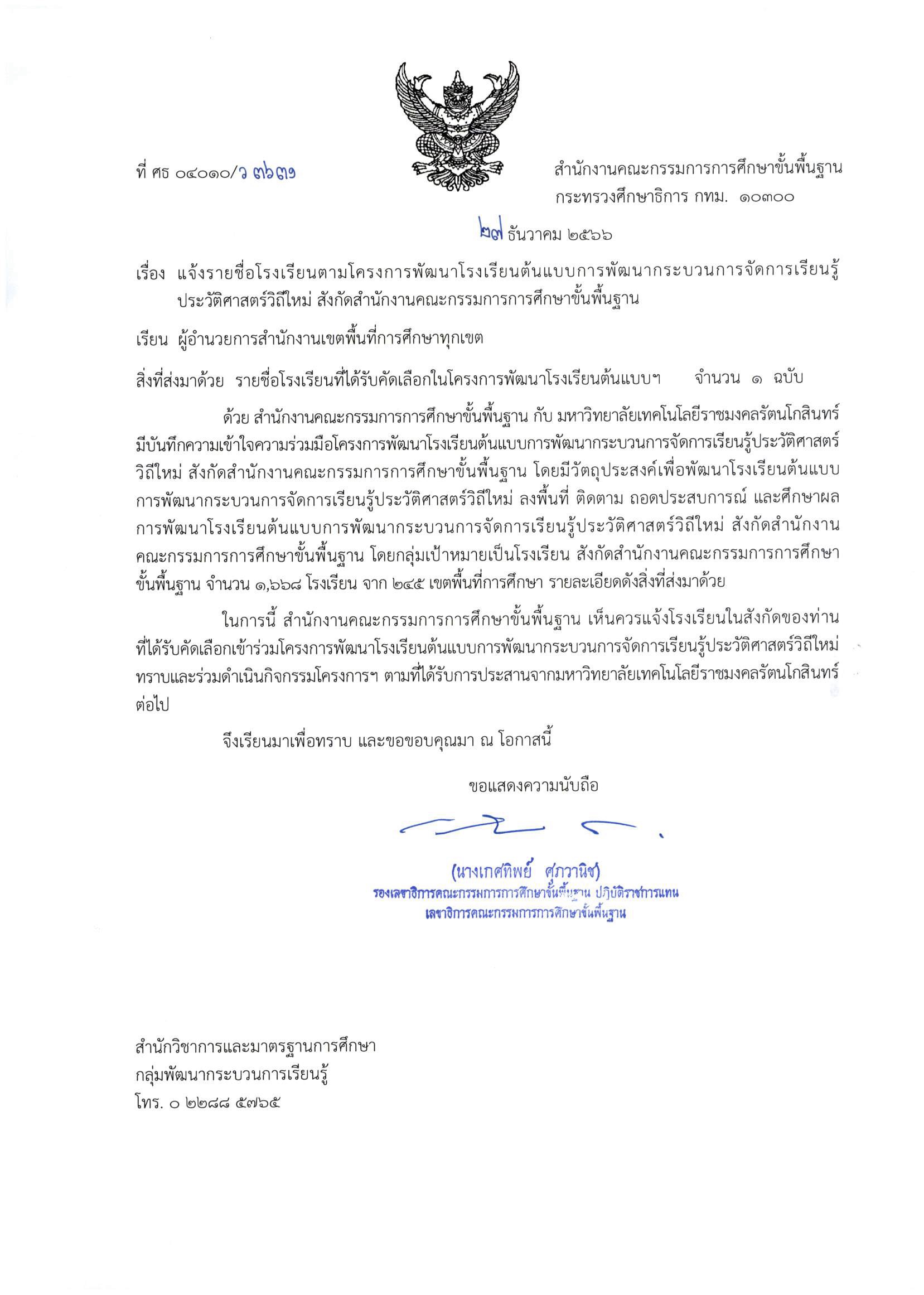 แจ้งรายชื่อโรงเรียนตามโครงการพัฒนาโรงเรียนต้นแบบการพัฒนากระบวนการจัดการเรียนรู้ประวัติศาสตร์วิถีใหม่ สังกัดสำนักงานคณะกรรมการการศึกษาขั้นพื้นฐาน