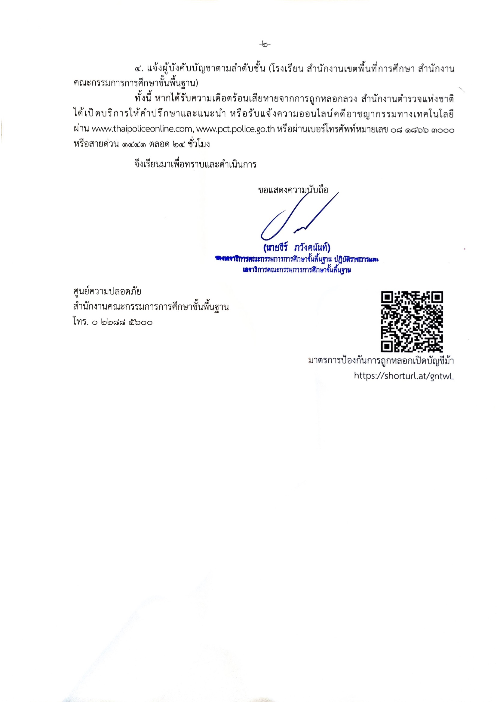 สำนักงานคณะกรรมการการศึกษาขั้นพื้นฐาน โดย ศูนย์ความปลอดภัย มีหนังสือที่ ศธ 04277/ว1106 ลงวันที่ 29 ธค 2566 เรื่อง มาตรการป้องกันการถูกหลอกเปิดบัญชีม้าของนักเรียน ข้าราชการครูและบุคลากรทางการศึกษา สังกัดสำนักงานคณะกรรมการการศึกษาขั้นพื้นฐาน รายละเอียด ดังนี้