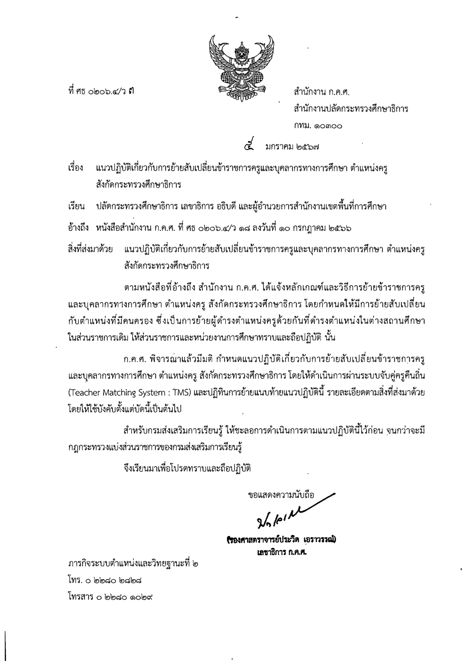 ว3/2567 แนวปฏิบัติเกี่ยวกับการย้ายสับเปลี่ยนข้าราชการครูและบุคลากรทางการศึกษา ตำแหน่งครู สังกัดกระทรวงศึกษาธิการ