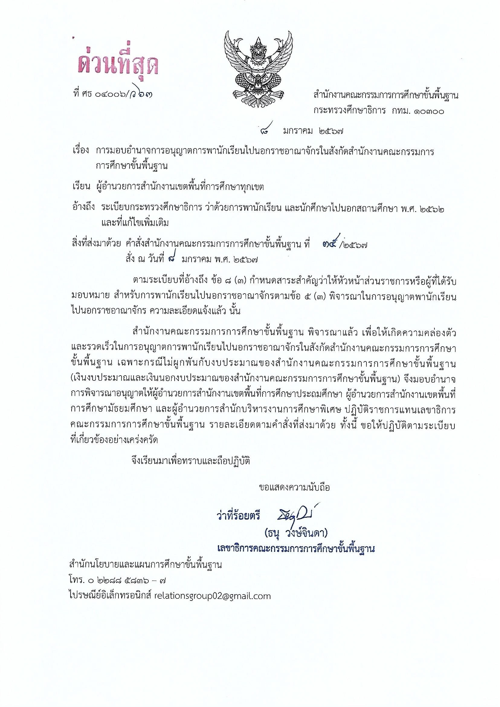 สำนักงานคณะกรรมการการศึกษาขั้นพื้นฐาน พิจารณาแล้ว เพื่อให้เกิดความคล่องตัวและรวดเร็วในการอนุญาตการพานักเรียนไปนอกราชอาณาจักรในสังกัดสำนักงานคณะกรรมการการศึกษาขั้นพื้นฐาน เฉพาะกรณีไม่ผูกพันกับงบประมาณของสำนักงานคณะกรรมการการศึกษาขั้นพื้นฐาน (เงินงบประมาณ และเงินนอกงบประมาณของสำนักงานคณะกรรมการการศึกษาขั้นพื้นฐาน) จึงมอบอำนาจการพิจารณาอนุญาตให้ผู้อำนวยการสำนักงานเขตพื้นที่การศึกษาประถมศึกษา ผู้อำนวยการสำนักงานเขตพื้นที่การศึกษามัธยมศึกษา และผู้อำนวยการสำนักบริหารงานการศึกษาพิเศษ ปฏิบัติราชการแทนเลขาธิการคณะกรรมการการศึกษาขั้นพื้นฐาน รายละเอียดตามคำสั่งที่ส่งมาด้วย ทั้งนี้ ขอให้ปฏิบัติตามระเบียบที่เกี่ยวข้องอย่างเคร่งครัด จึงเรียนมาเพื่อทราบและถือปฏิบัติ
